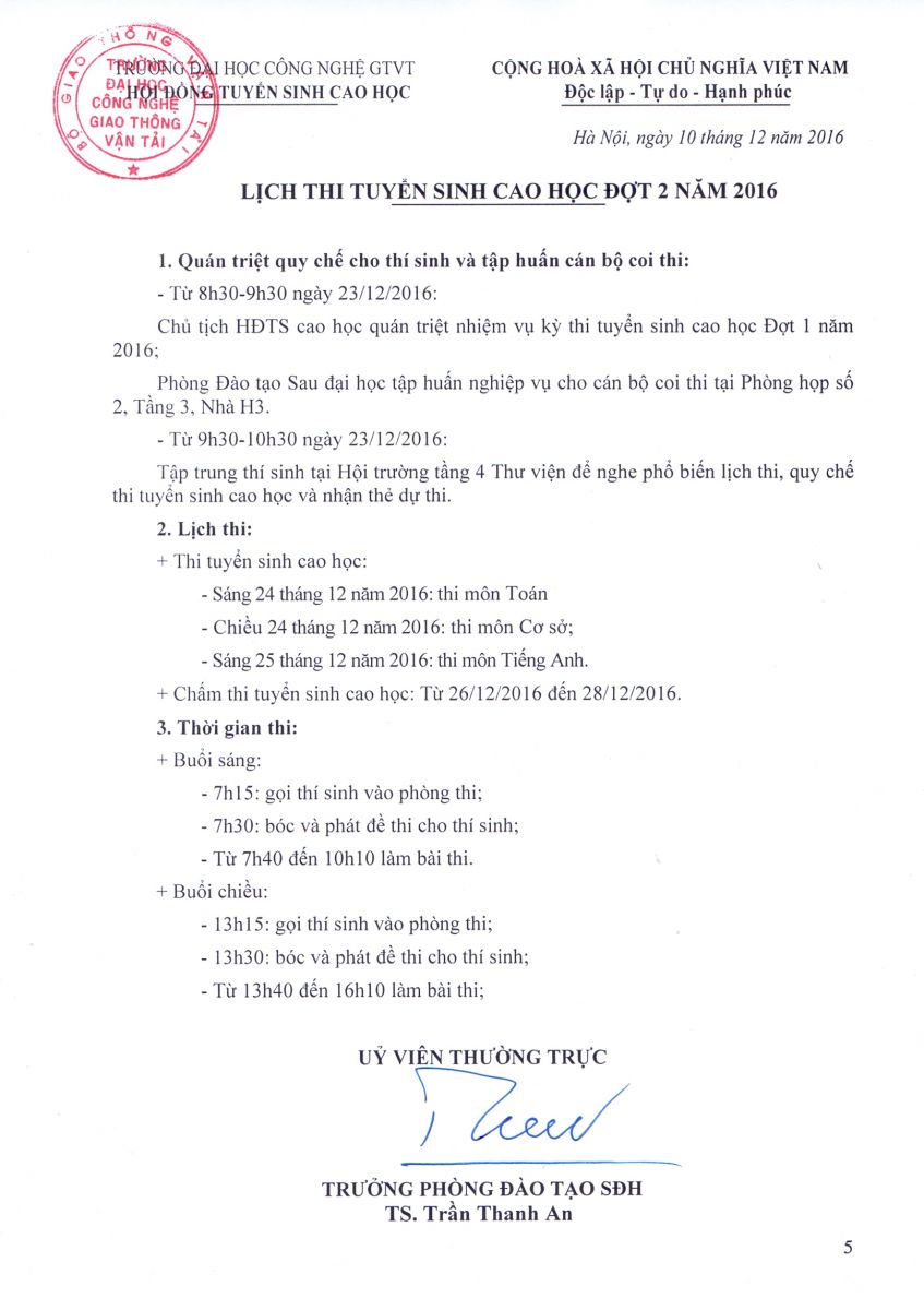 Thông báo về lịch thi tuyển sinh cao học đợt 2 - Năm 2016
