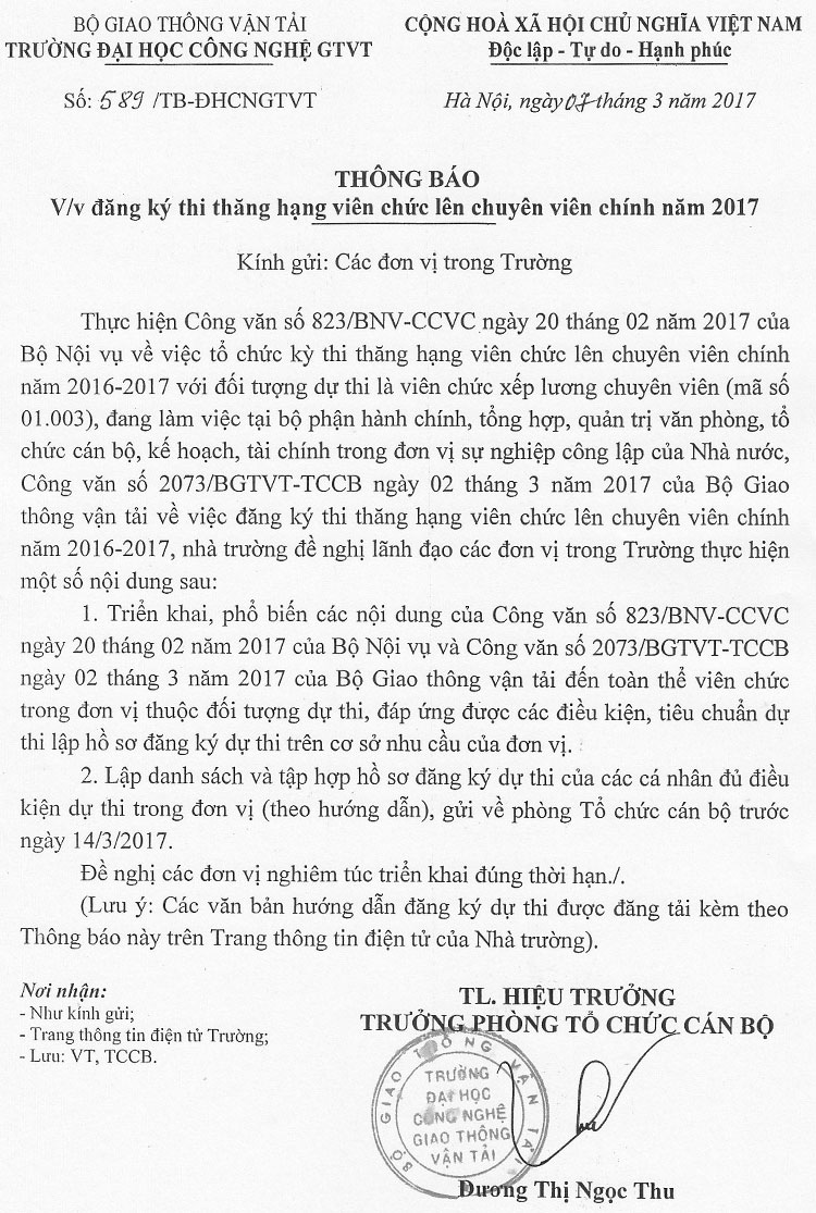 Văn bản nội bộ của Trường Đại học Công nghệ GTVT phục vụ kỳ thi tuyển dụng viên chức...