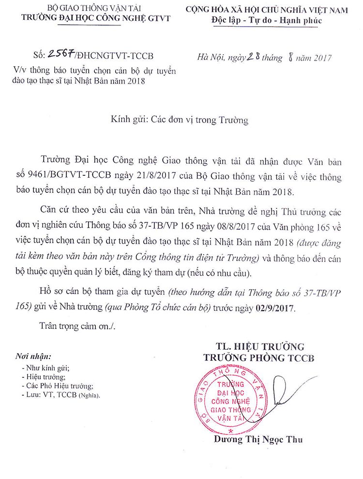 Văn bản nội bộ của Trường Đại học Công nghệ GTVT phục vụ kỳ thi tuyển dụng viên chức...