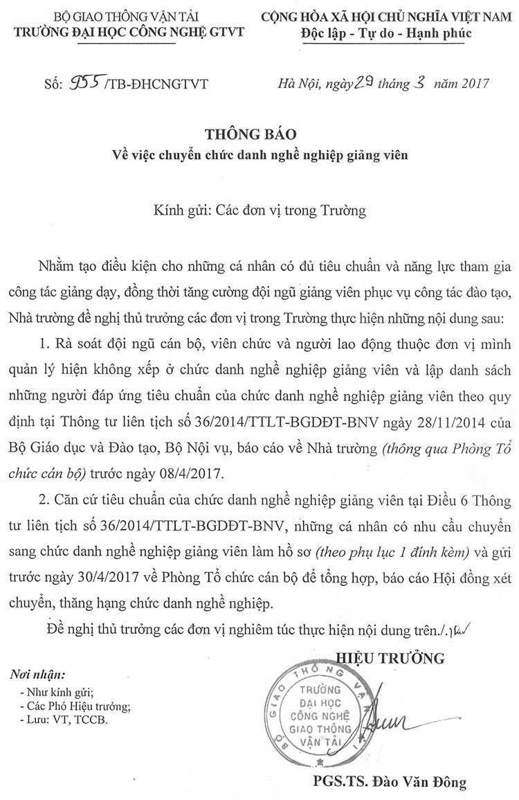 Thông báo về việc chuyển chức danh nghề nghiệp giảng viên