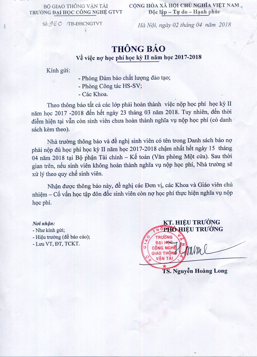 THÔNG BÁO VỀ VIỆC NỢ HỌC PHÍ HỌC KỲ II NĂM HỌC 2017-2018