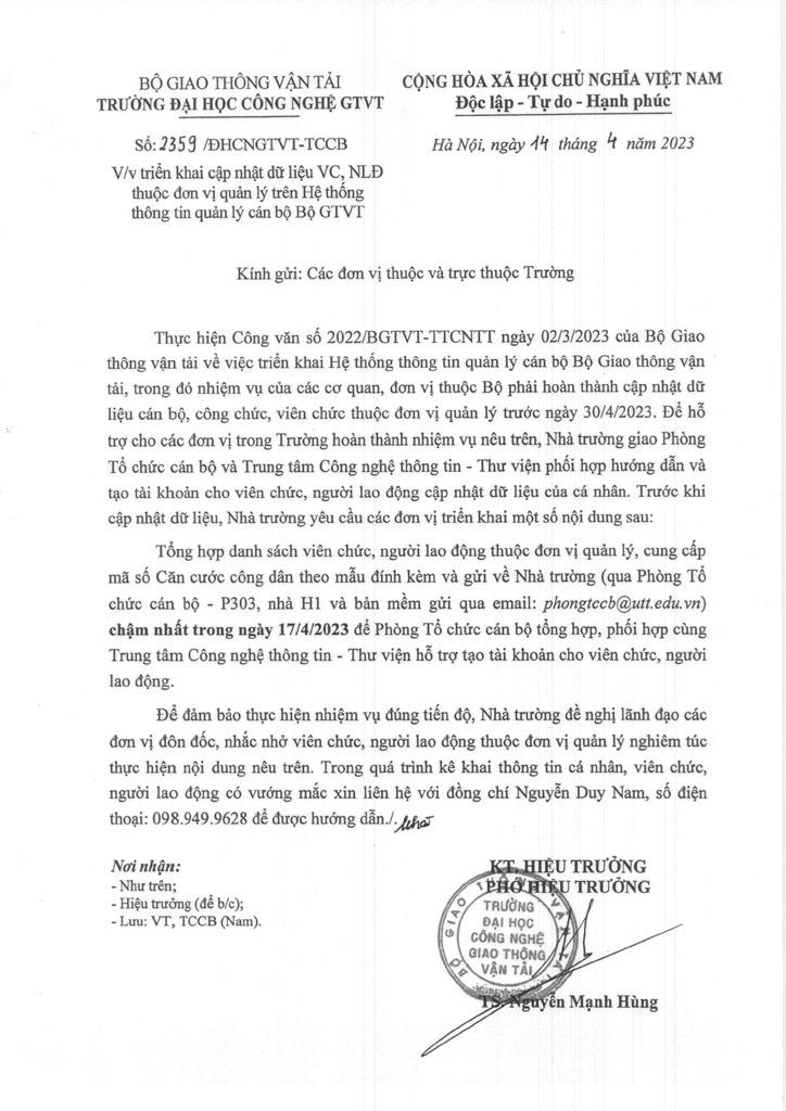 Thông báo về việc triển khai cập nhật dữ liệu VC, NLĐ thuộc đơn vị quản lý trên Hệ thống thông tin quản lý cán bộ Bộ GTVT