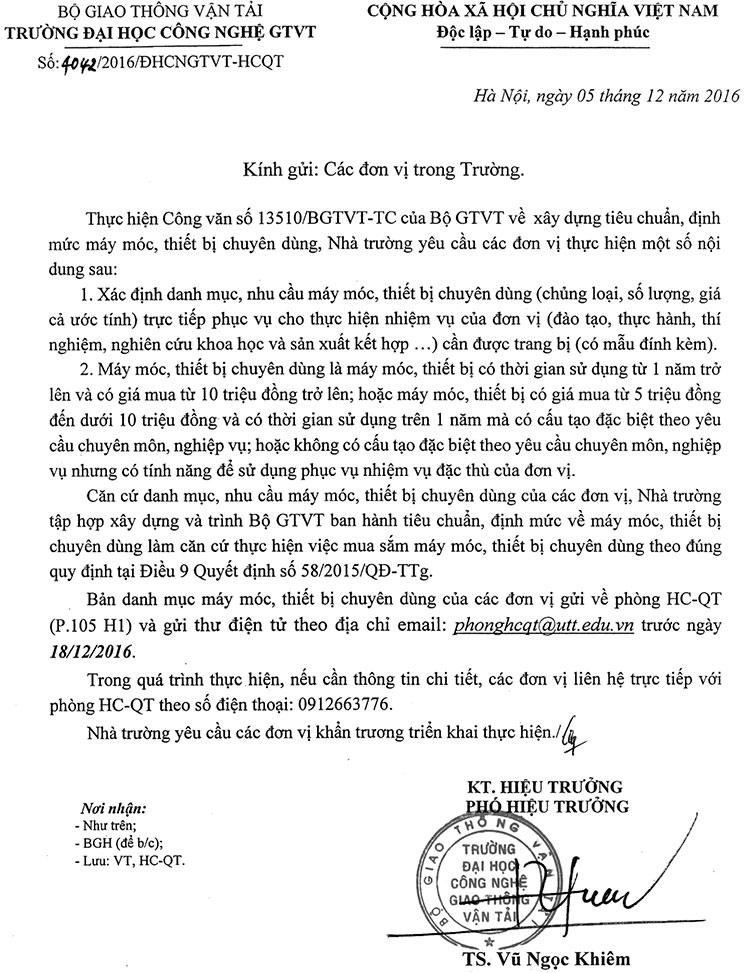 Thông báo xây dựng tiêu chuẩn, định mức máy móc, thiết bị chuyên dùng