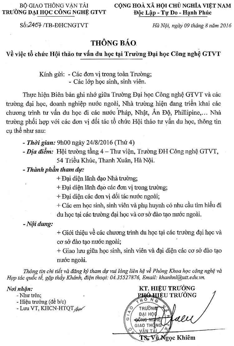 Thông báo tổ chức Hội thảo tư vấn du học tại Trường Đại học Công nghệ GTVT 10:10:37 15/08/16 Hợp tác đào tạo Quốc tế