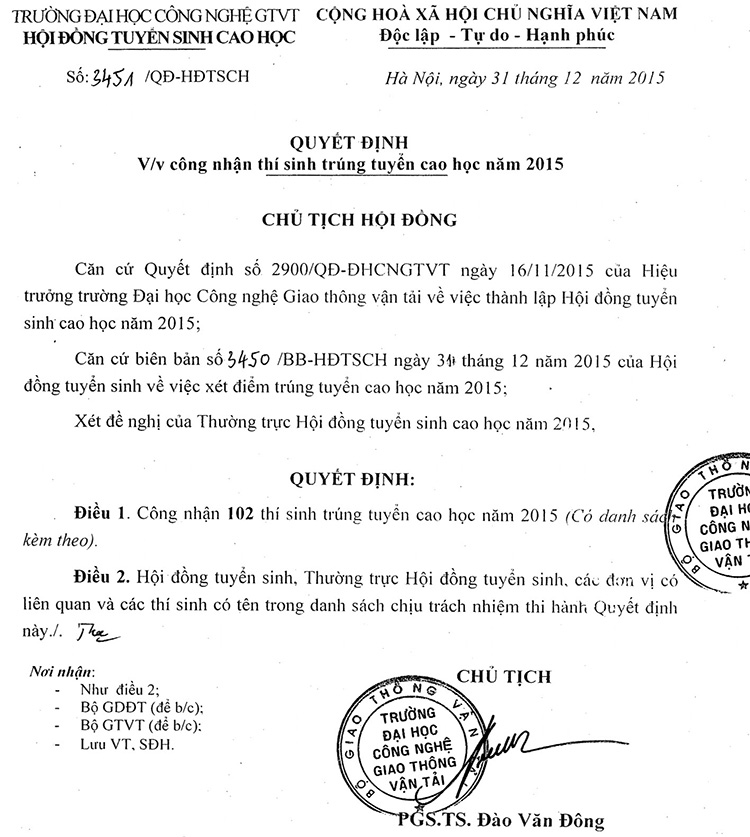 Thông báo Danh sách thí sinh trúng tuyển Cao học năm 2015