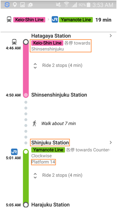 Giả sử, chúng ta chọn cách đi thứ nhất. Đầu tiên, tại ga Hatagaya chúng ta đi theo Keio Line hướng ShinsenShinjuku đến ga Shinjuku. Tại đây, chúng ta chuyển sang JR Line theo đường số 14 và cuối cùng là xuống ở Harajuku sau khi đi mất 4 phút.