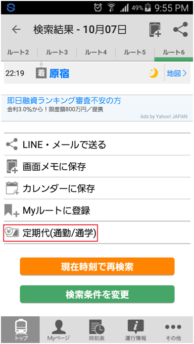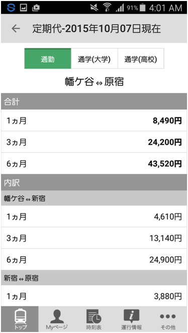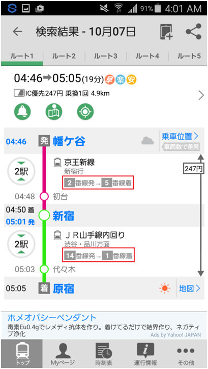 Theo sơ đồ hướng dẫn có thể thấy, ở Hatagaya đi tuyến Keio tại đường số 2, đến Shinjuku tại đường số 5. Tại đây chuyển sang tuyến JR trên đường ray số 14 và đến Harajuku ở đường số 1. Tổng cộng giá vé cả chặng nếu mua bằng thẻ là 247¥. Tại đây nếu muốn xem vé tháng bạn có thể kéo xuống chọn biểu tượng thẻ như hình.
