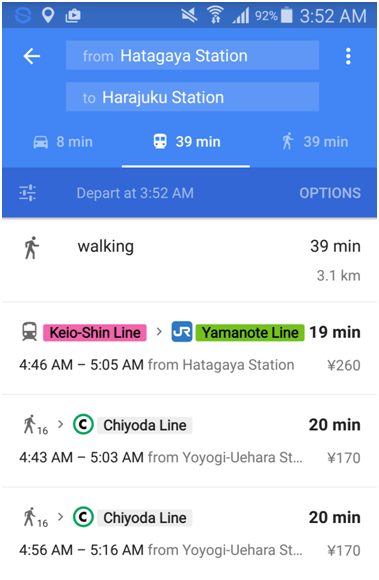 Ví dụ: chúng ta đi từ Hatagaya Station đến Harajuku Station có 2 chọn lựa: