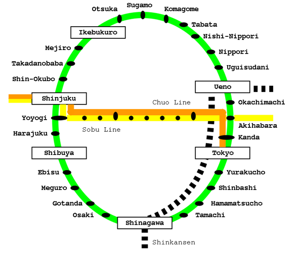 - Tàu điện ở Tokyo được sử dụng nhiều nhất là JR Line – 山手線 – Yamanote Line với bảng hiệu màu xanh lá. Đây là dịch vụ của công ty Japan Raiway Group, thuộc sở hữu của chính phủ Nhật. Tuyến này chạy vòng quanh Tokyo và đi qua 6 ga lớn là: Tokyo, Ueno, Ikebukuro, Shinjuku, Shibuya và Shinagawa.
