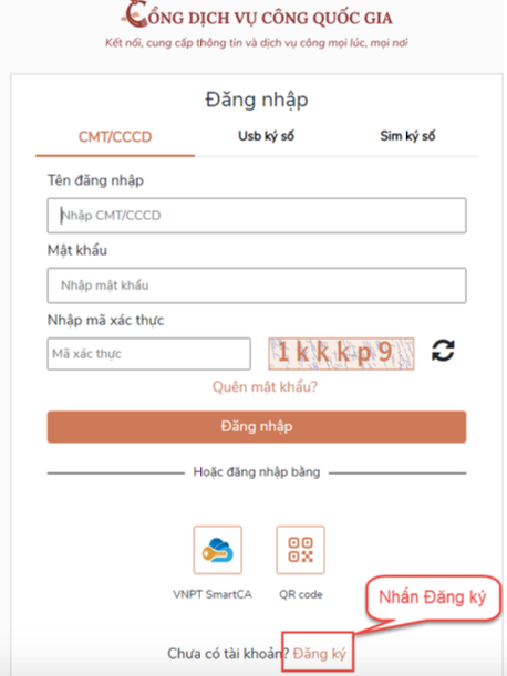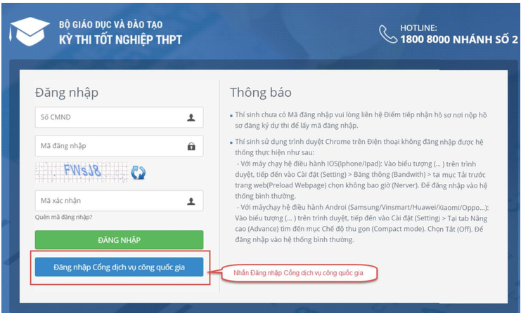 Cách 2: Thí sinh đăng nhập bằng dịch vụ công sau đó nhập phiếu đăng ký.