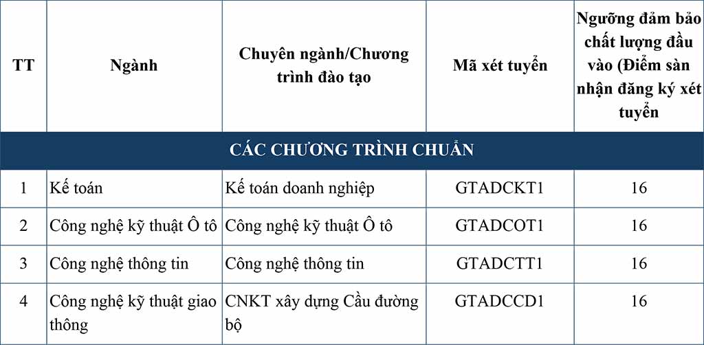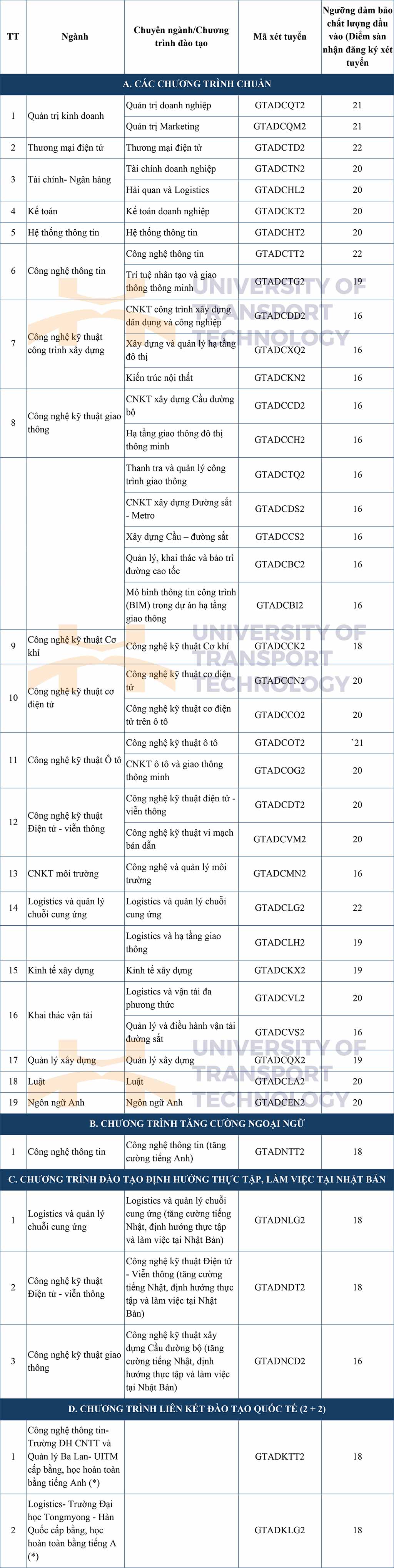 Trường Đại học Công nghệ Giao thông vận tải thông báo ngưỡng đảm bảo chất lượng đầu vào (điểm sàn nhận đăng ký xét tuyển) đại học chính quy đối với phương thức xét tuyển bằng điểm thi THPT năm 2024 như sau: