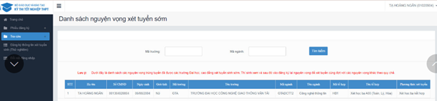 Bước 3: Vào mục “Tra cứu” để biết các nguyện vọng đã đủ điều kiện trúng tuyển về điểm (trừ điều kiện tốt nghiệp THPT).