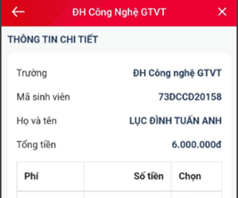 màn hình xuất hiện thông tin sinh viên và số tiền cần thanh toán, click “THANH TOÁN” và thực hiện các bước tiếp theo cho đến lúc nhận được thông báo thành công.