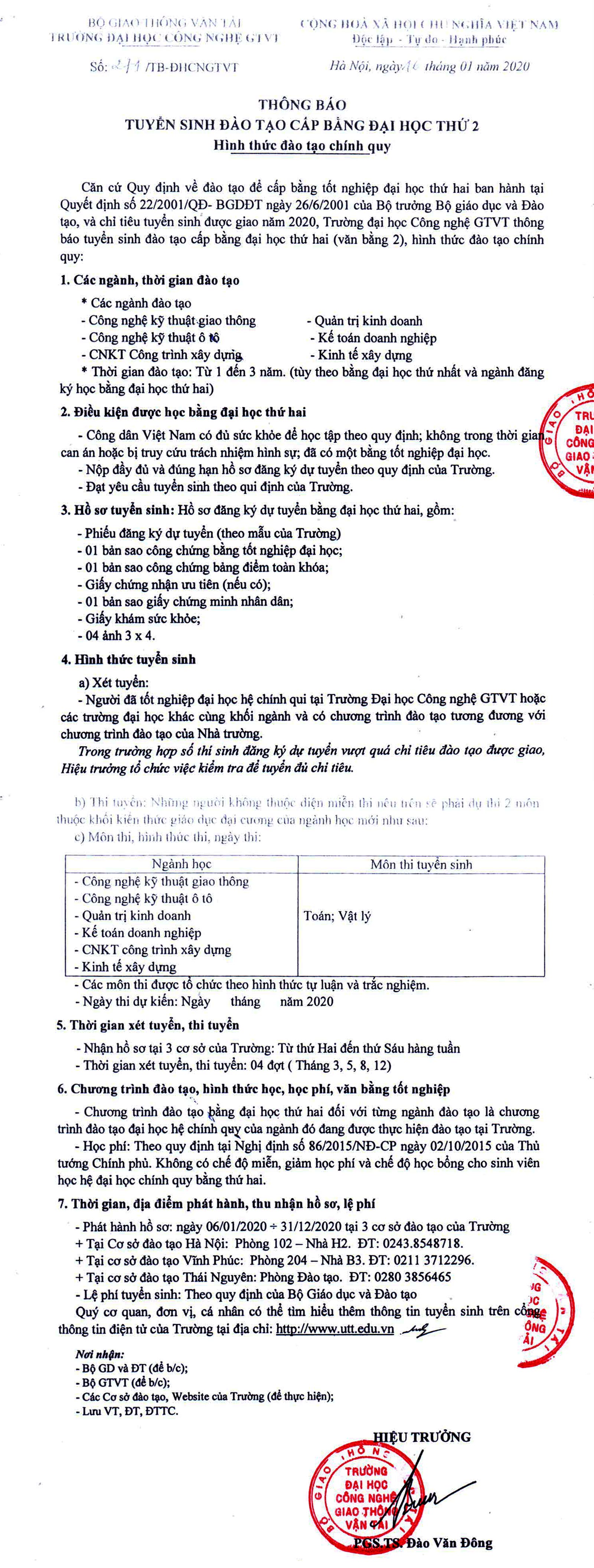 Thông báo Tuyển sinh đào tạo cấp bằng đại học thứ 2 (Hình thức đào tạo chính quy)