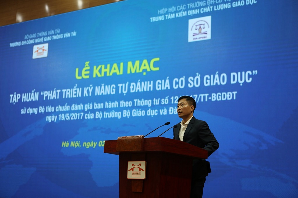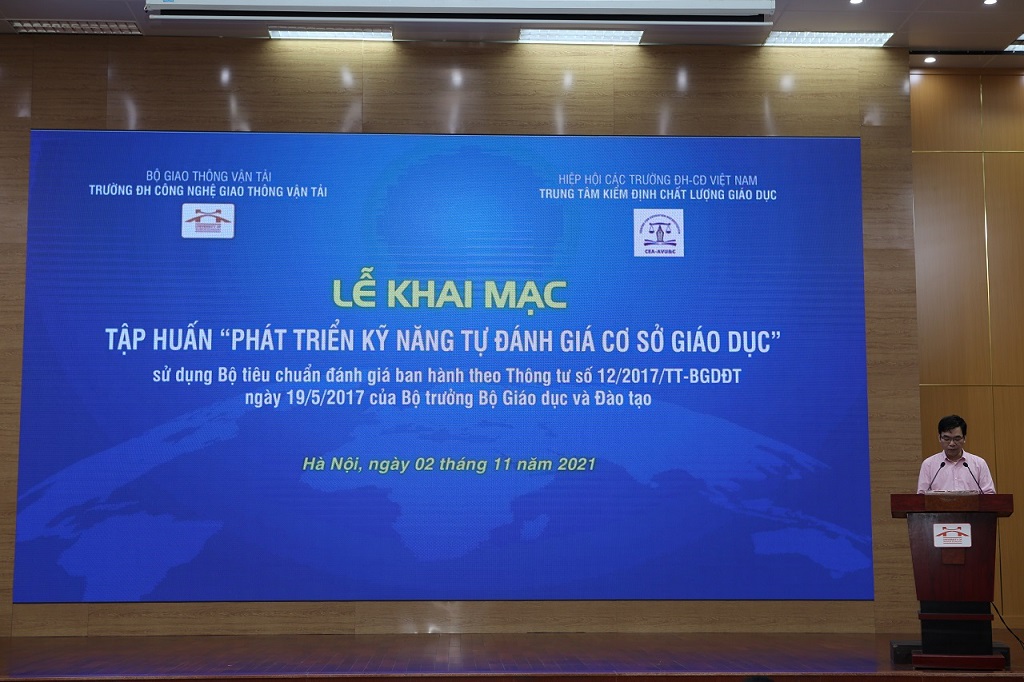 Sáng 02/11 tại Hà Nội, Trường Đại học Công nghệ GTVT đã khai mạc lớp tập huấn Phát triển kỹ năng tự đánh giá Cơ sở giáo dục theo Bộ tiêu chuẩn đánh giá ban hành kèm theo Thông tư 12/2017/TT-BGDĐT. Tham dự có lãnh đạo Đảng ủy, Ban Giám hiệu, Hội đồng trường; Công đoàn, Đoàn Thanh niên; lãnh đạo các đơn vị và cán bộ, giảng viên của Nhà trường.