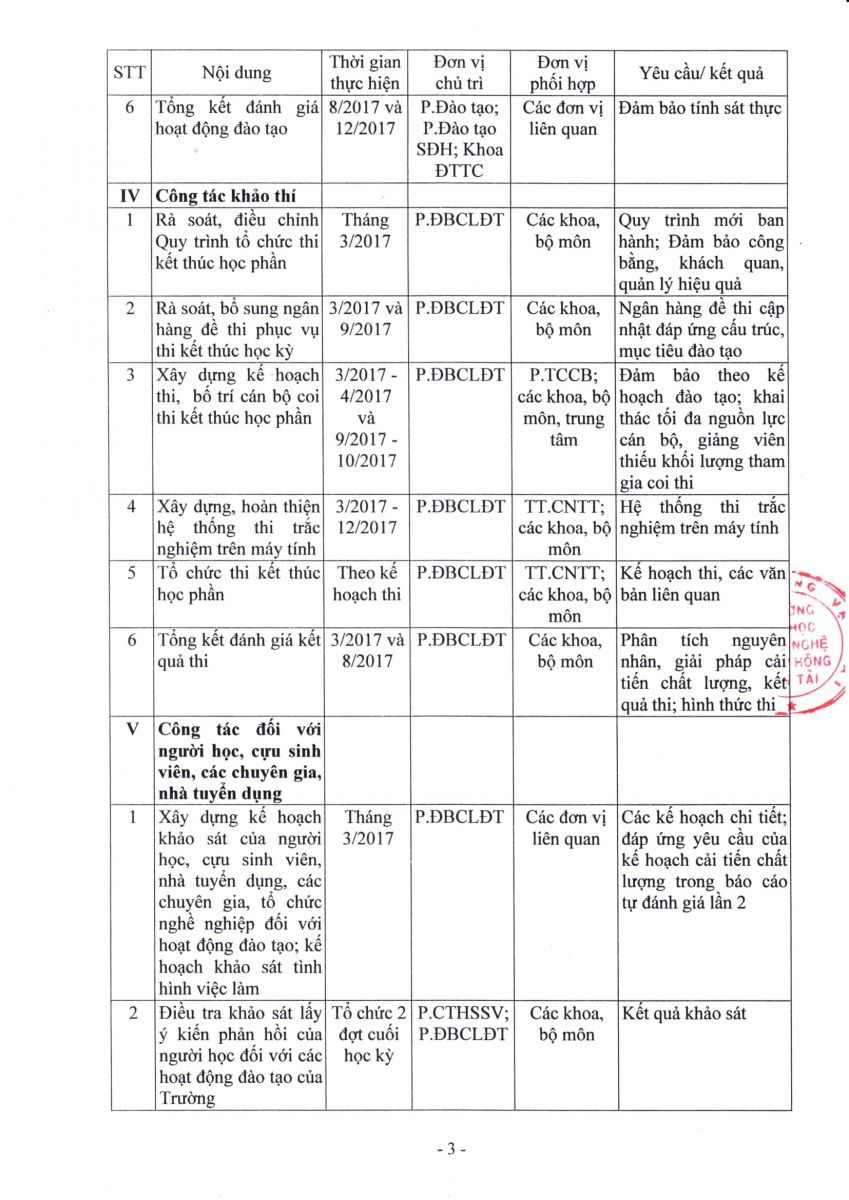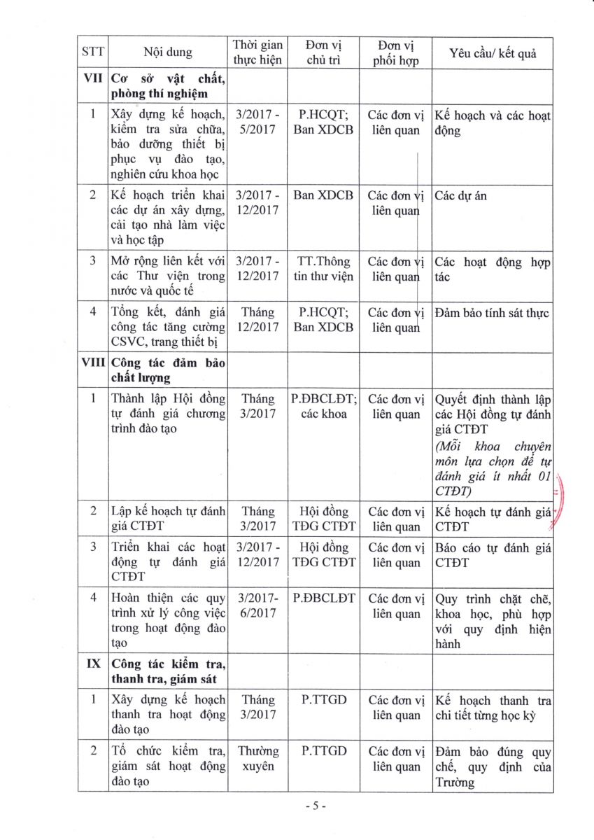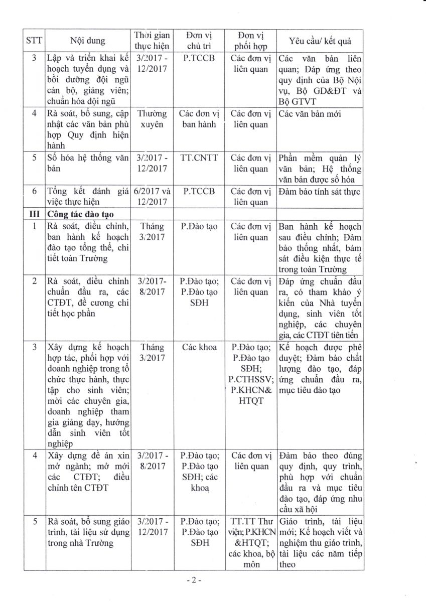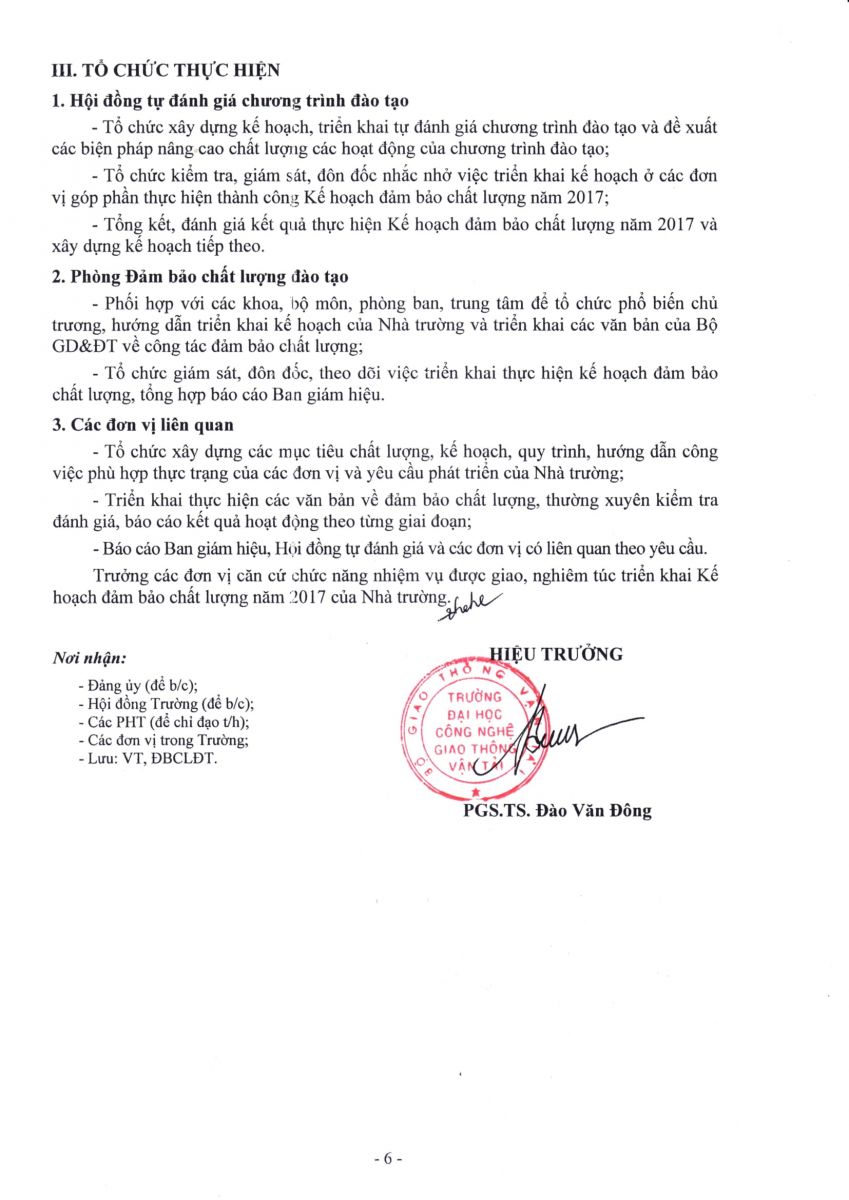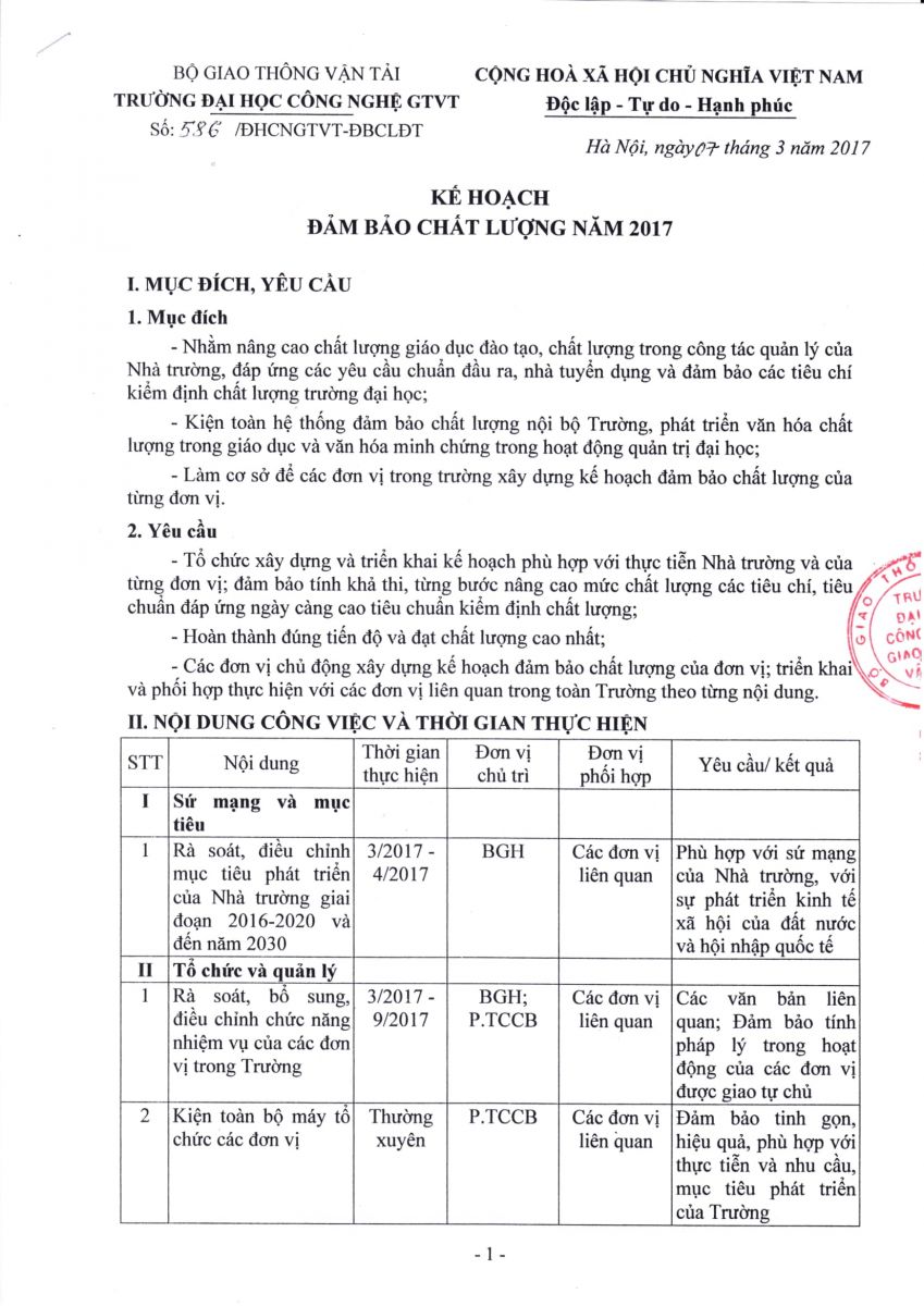 Ngày 07 tháng 3 năm 2017, Hiệu trưởng Trường Đại học Công nghệ GTVT đã ban hành Kế hoạch số 586/ĐHCNGTVT-ĐBCLĐT về hoạt động Đảm bảo chất lượng năm 2017.