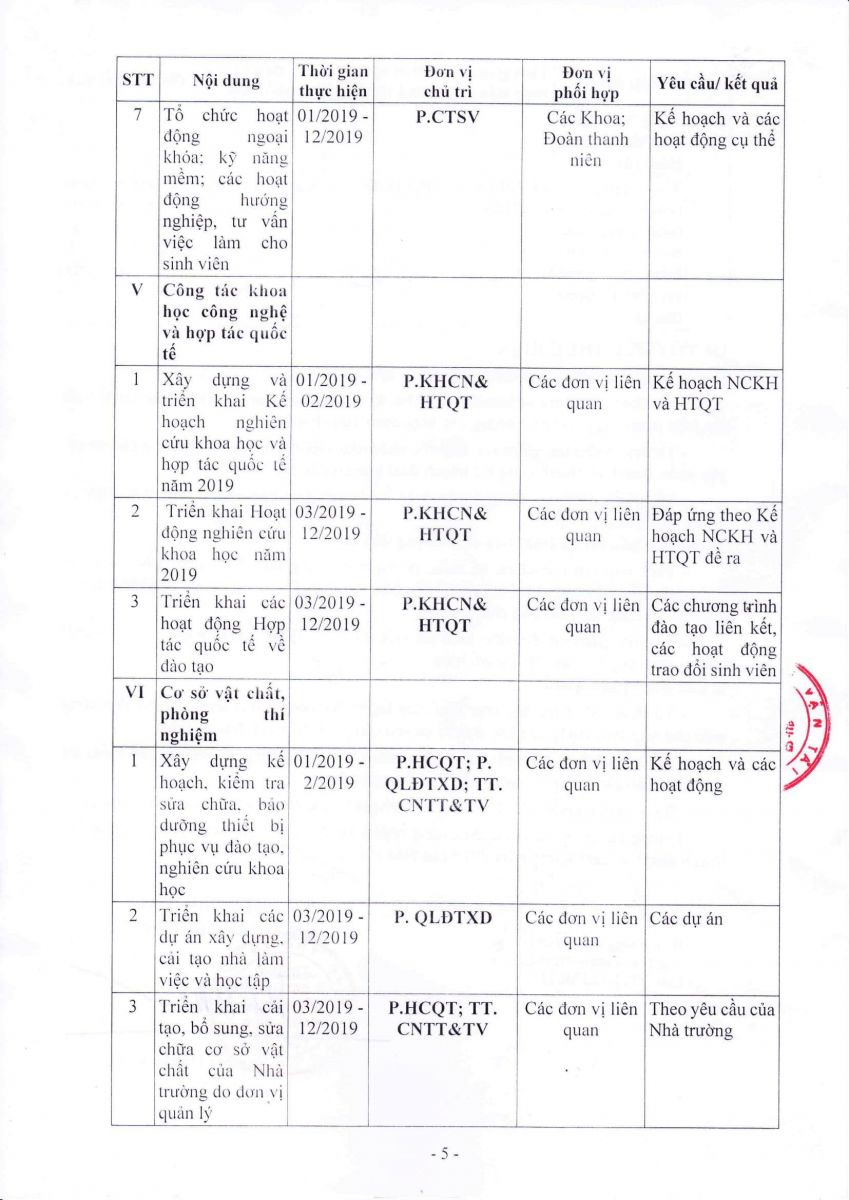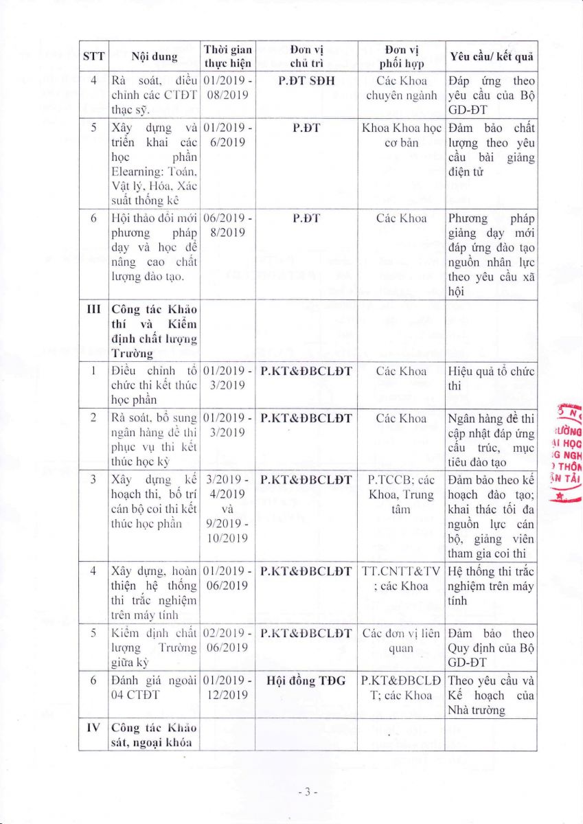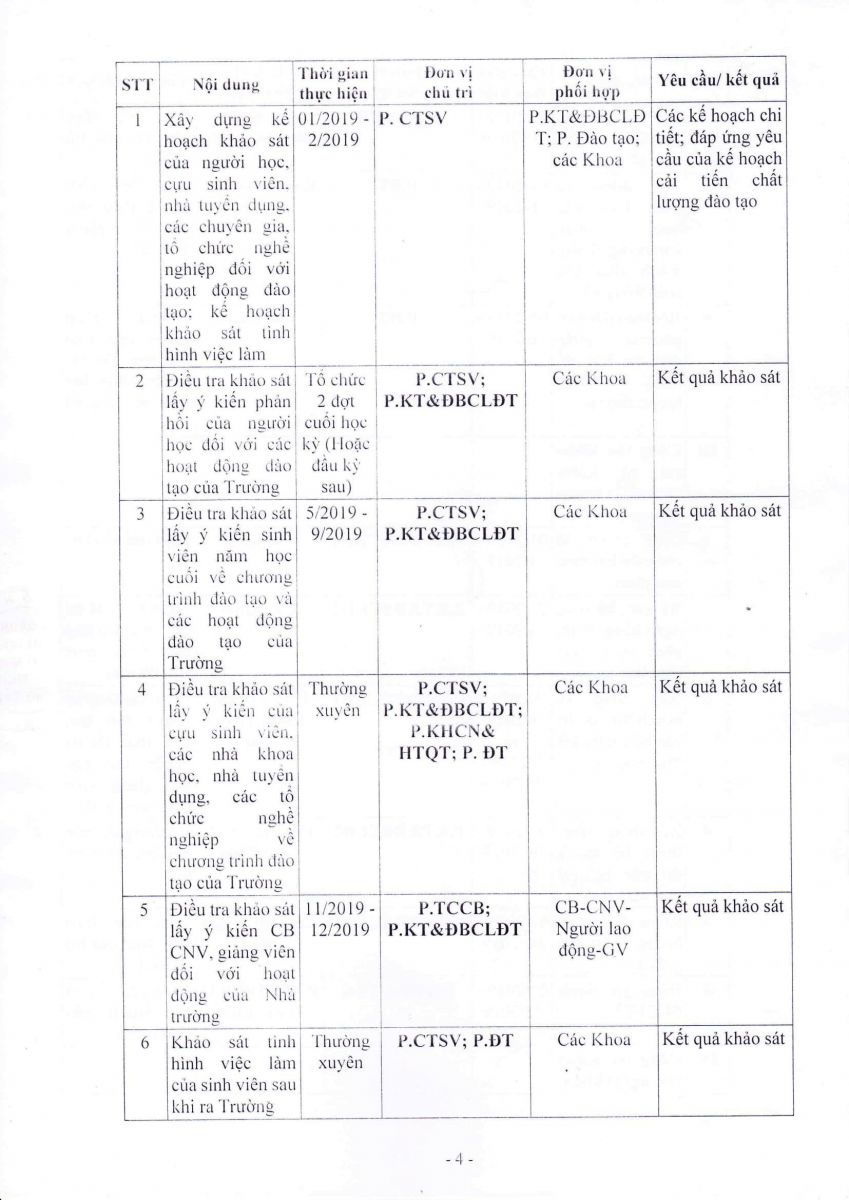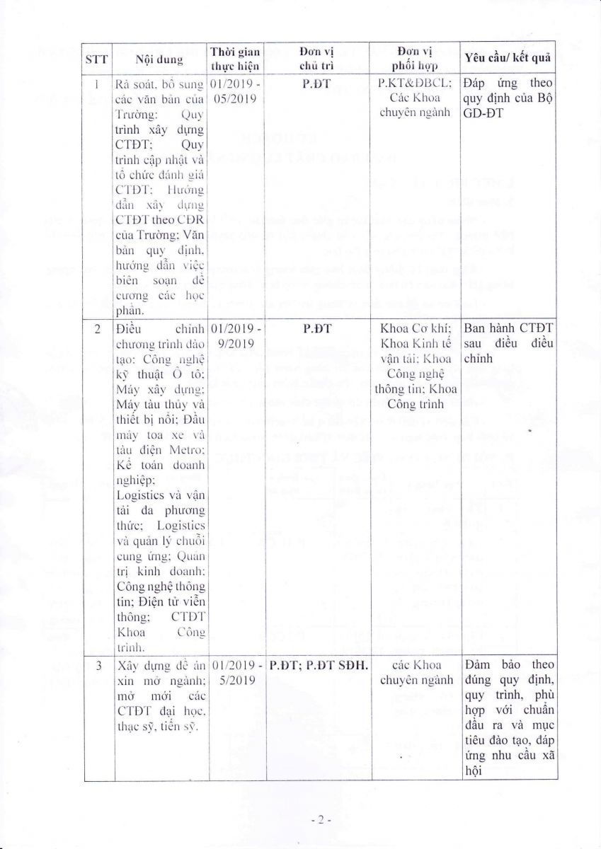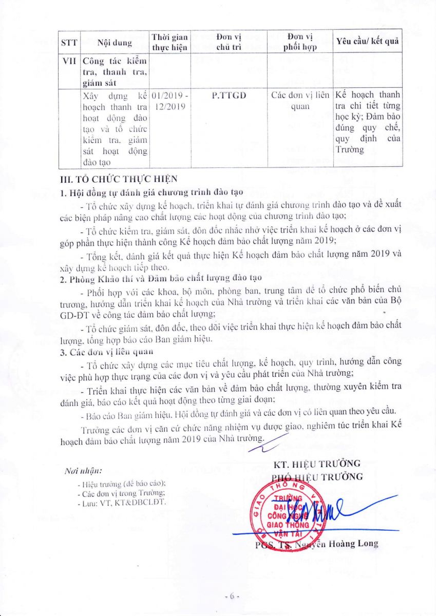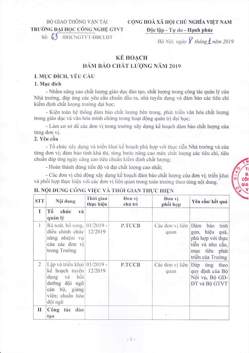 Ngày 08 tháng 01 năm 2019, Hiệu trưởng Trường Đại học Công nghệ GTVT đã ban hành Kế hoạch số 63/ĐHCNGTVT-ĐBCL về hoạt động Đảm bảo chất lượng năm 2019.