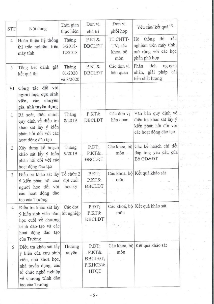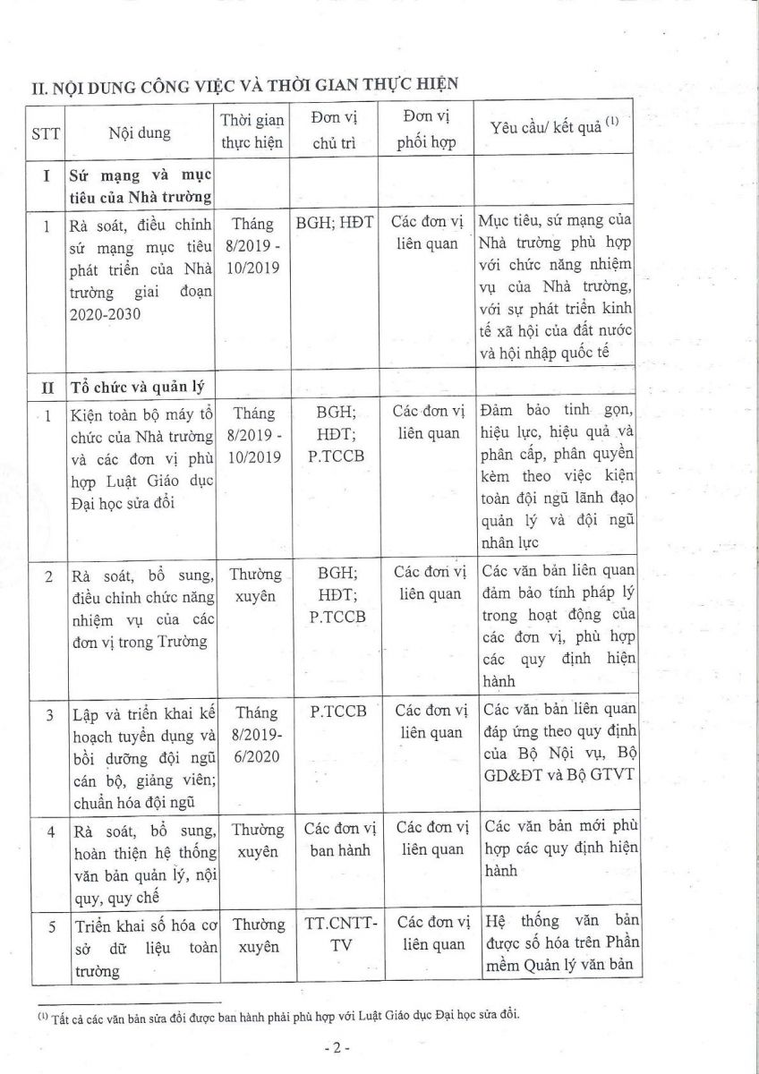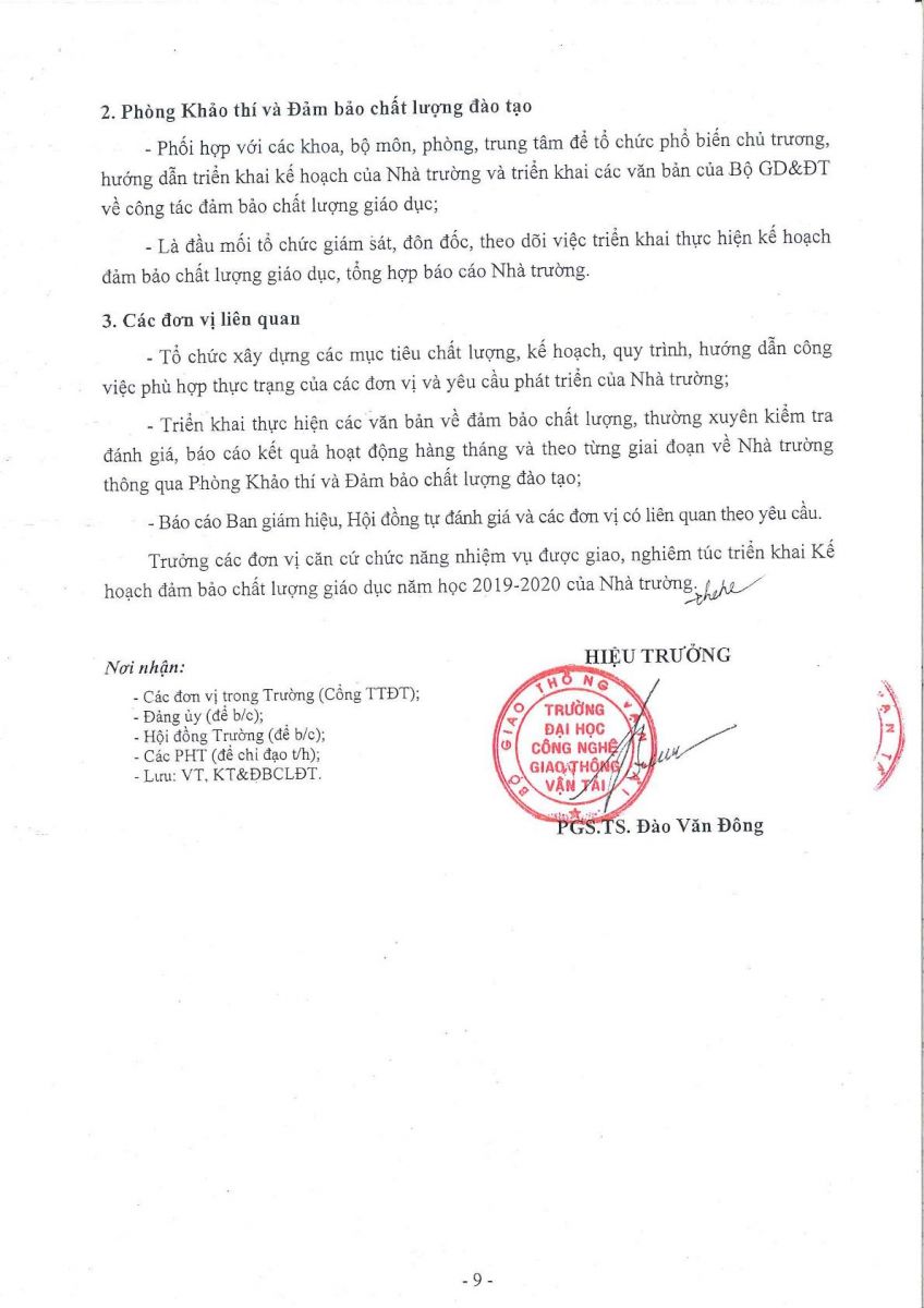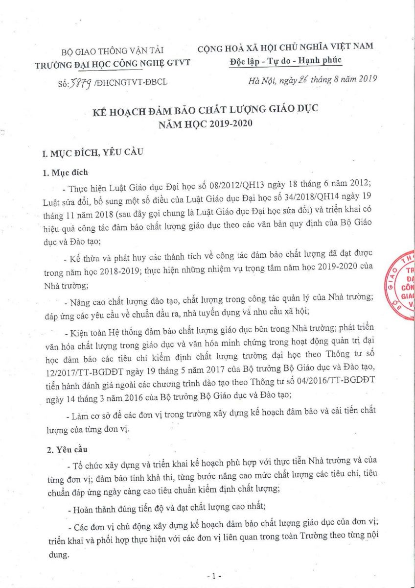 Ngày 26 tháng 8 năm 2019, Hiệu trưởng Trường Đại học Công nghệ GTVT đã ban hành Kế hoạch số 3879/ĐHCNGTVT-ĐBCL về hoạt động Đảm bảo chất lượng giáo dục năm học 2019-2020.