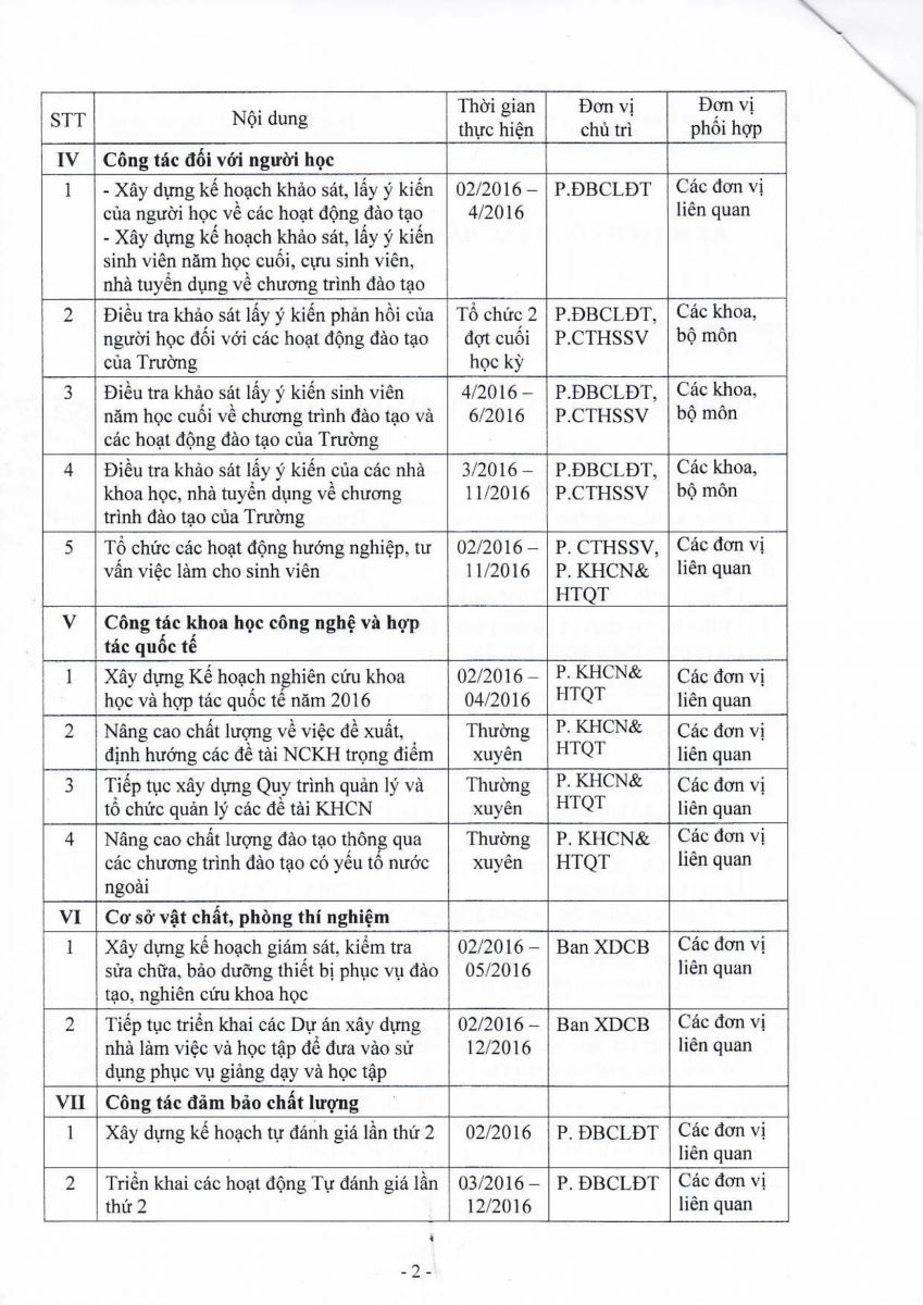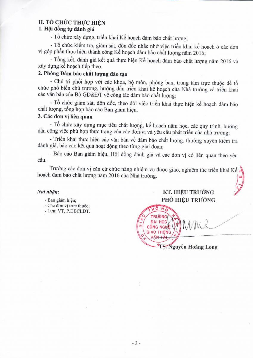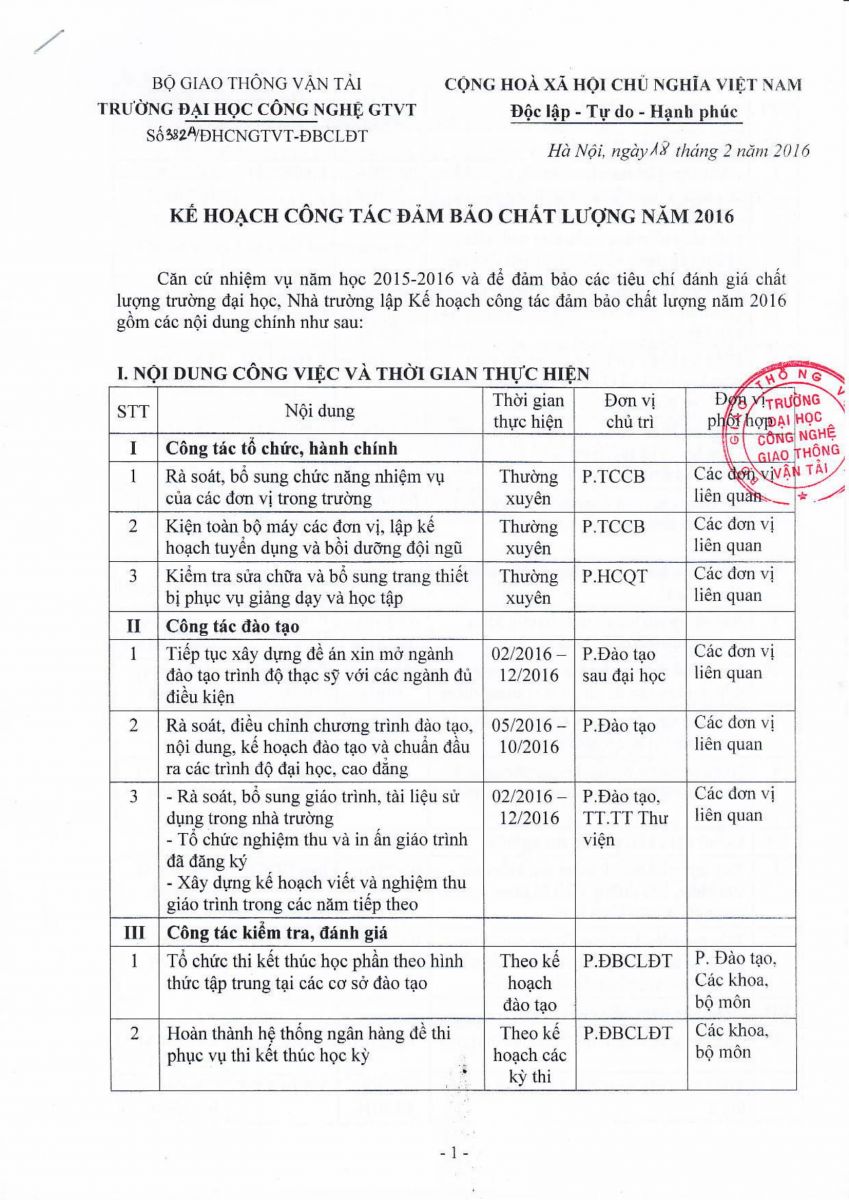 Ngày 18 tháng 02 năm 2016, Hiệu trưởng Trường Đại học Công nghệ GTVT đã ban hành Kế hoạch số 382a/ĐHCNGTVT-ĐBCLĐT về hoạt động Đảm bảo chất lượng năm 2016.