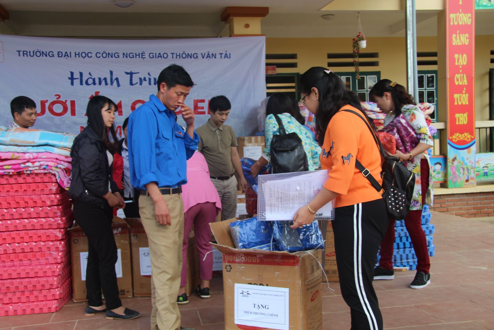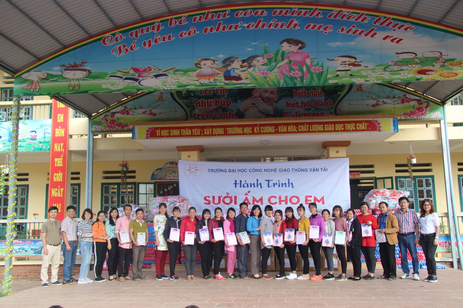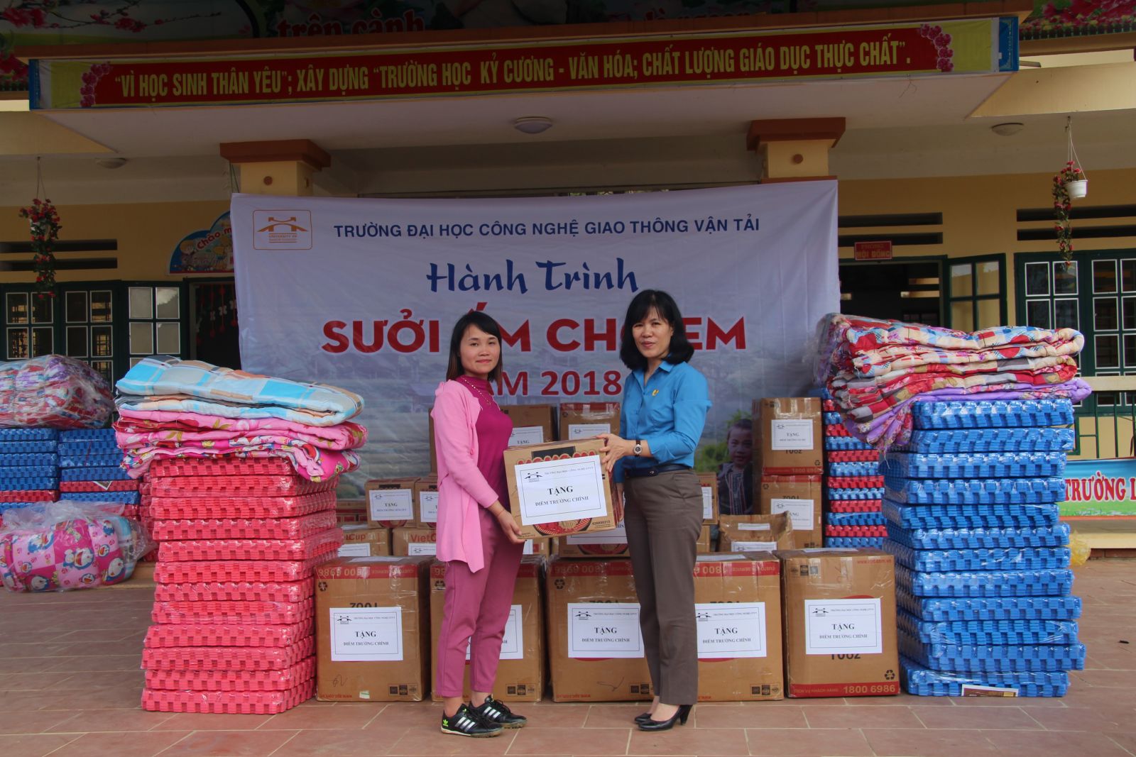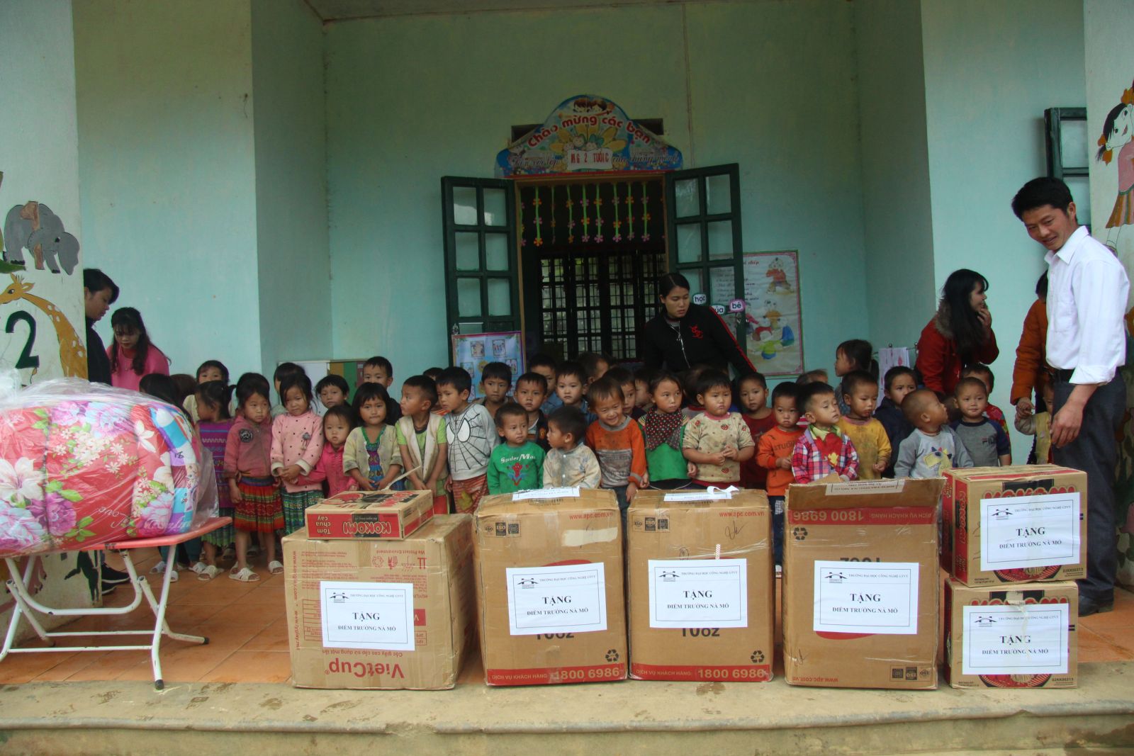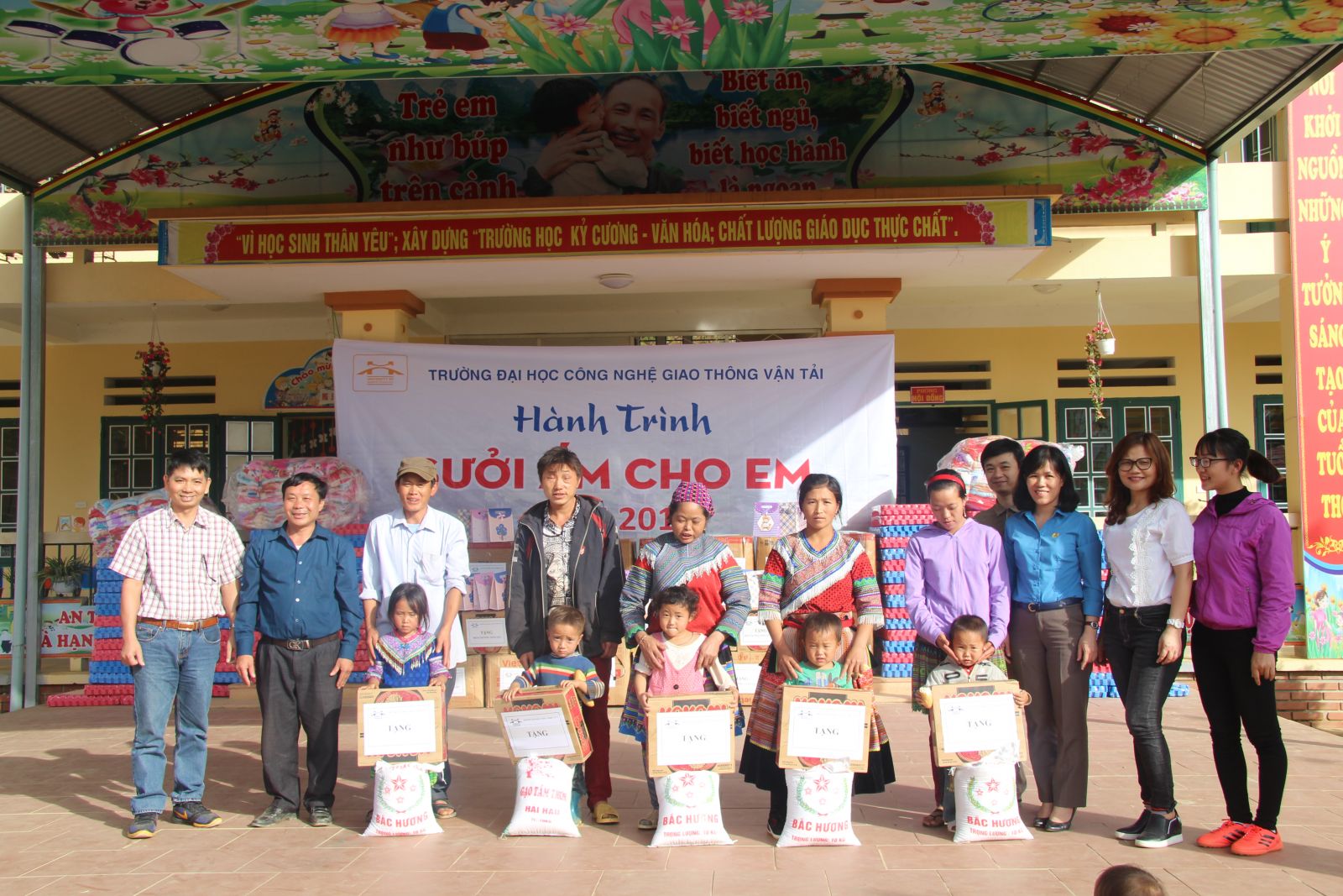 Thay mặt Nhà trường, đồng chí Lê Thu Sao - Chủ tịch Công đoàn Trường đã trao tặng đại điện Trường Mầm non và Xã số quà tặng gồm 255 áo khoác ấm, 255 đôi ủng, 300 khăn mặt, 520 đôi tất, 31 thùng mì tôm, 50 kg gạo, 290 m2 xốp trải sàn nhà, 260 suất quà gồm sữa, bánh kẹo, văn phòng phẩm; 31 khăn len ấm cho giáo viên cùng 255 cháu học sinh và 5 hộ gia đình có hoàn cảnh đặc biệt khó khăn. Những món quà trao tặng đều là những vật dụng mà các cháu và bà con nơi đây rất cần, giúp cải thiện phần nào điều kiện sinh hoạt thiếu thốn trong mùa đông giá rét. Tổng giá trị quà tặng của đoàn lên tới gần 51 triệu đồng.