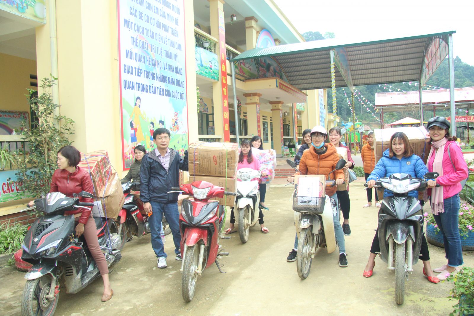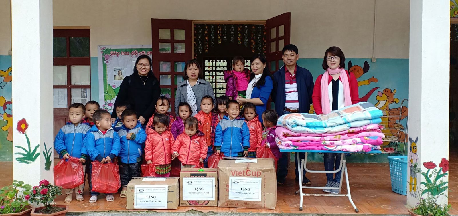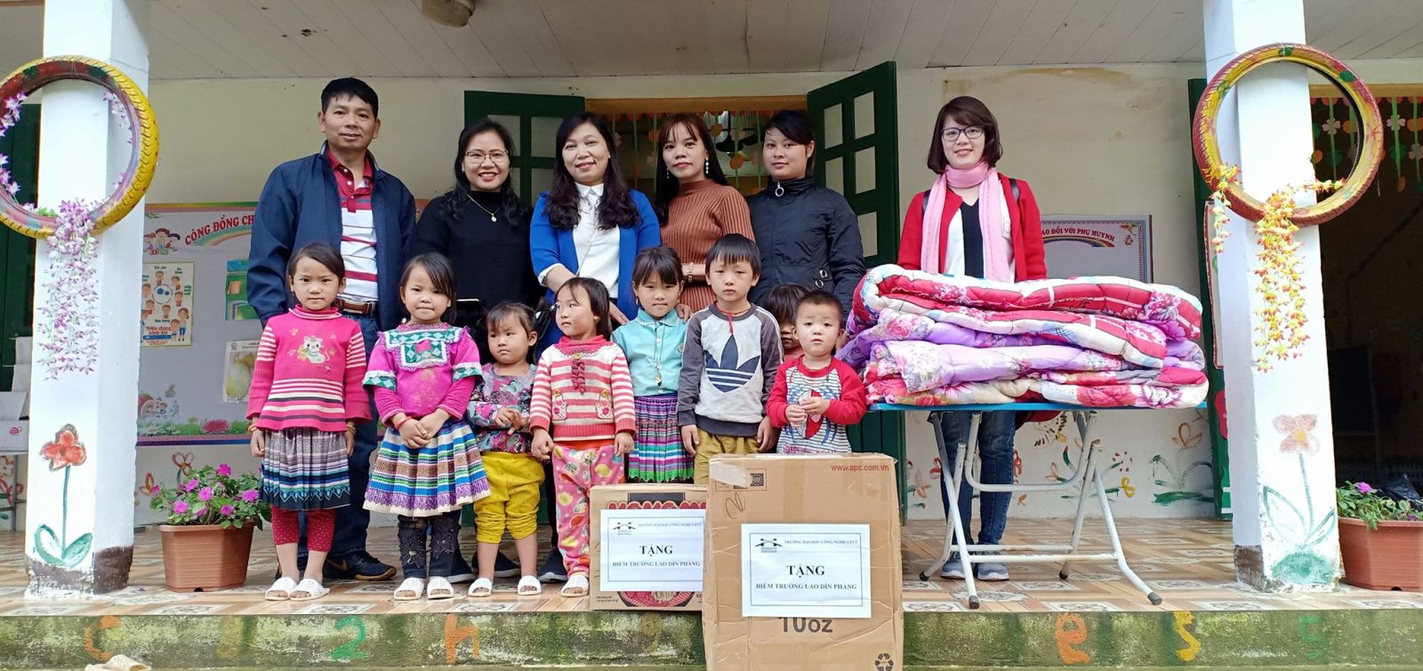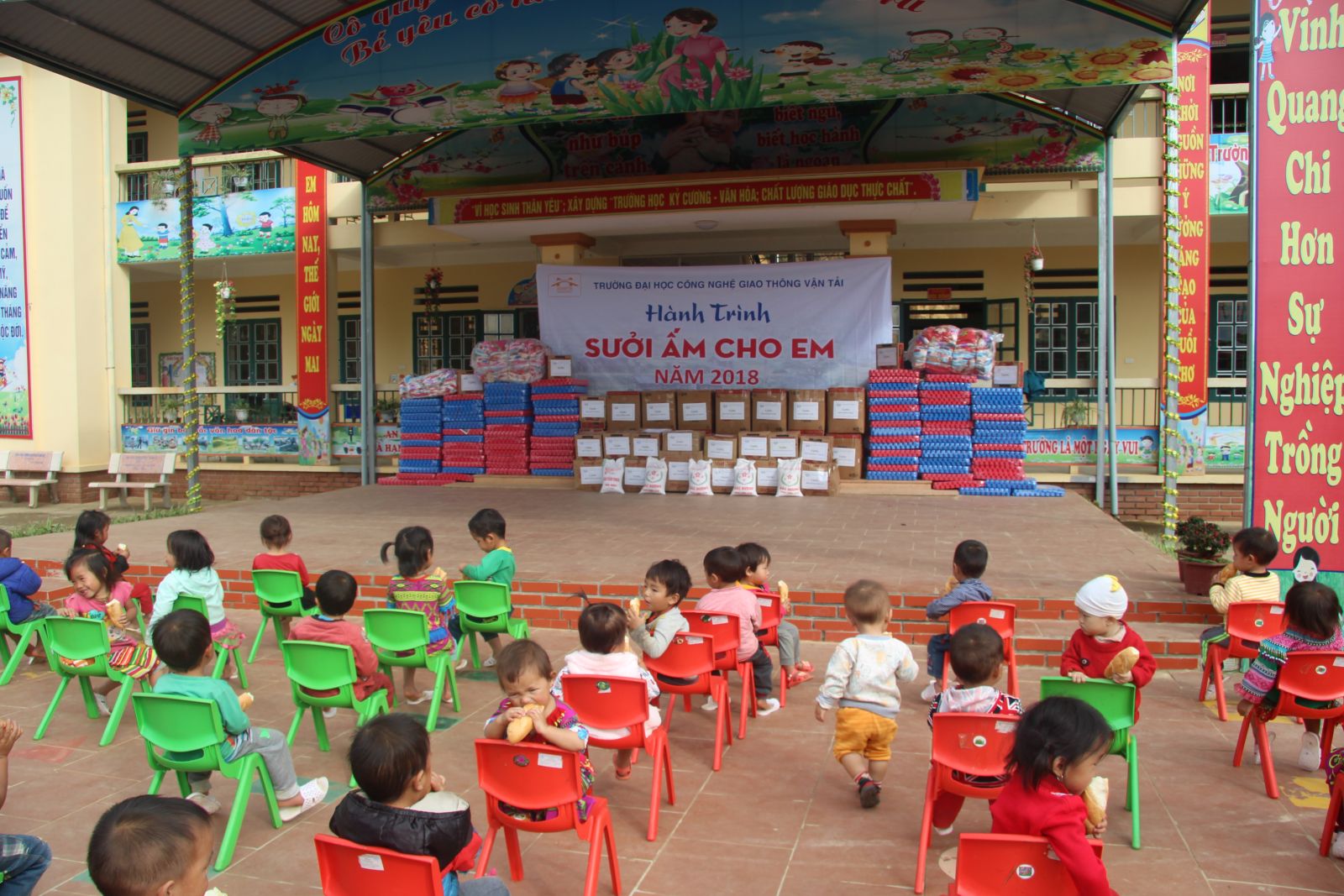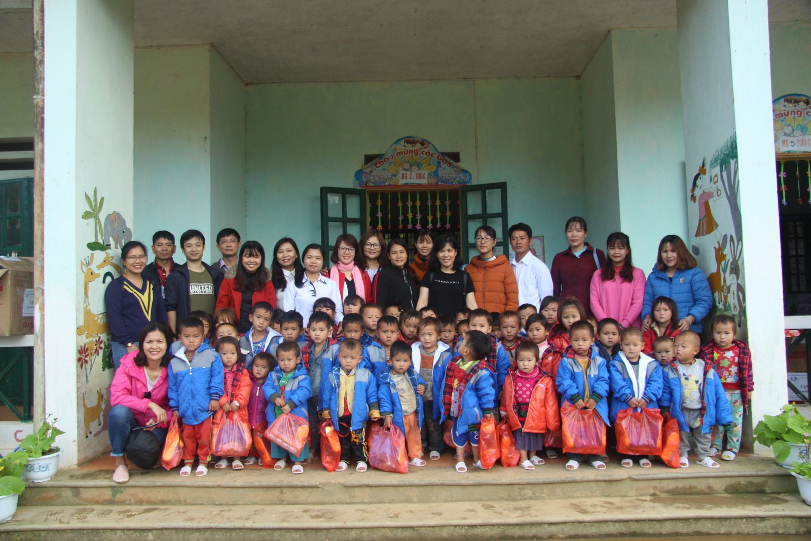 Thay mặt Nhà trường, đồng chí Lê Thu Sao - Chủ tịch Công đoàn Trường đã trao tặng đại điện Trường Mầm non và Xã số quà tặng gồm 255 áo khoác ấm, 255 đôi ủng, 300 khăn mặt, 520 đôi tất, 31 thùng mì tôm, 50 kg gạo, 290 m2 xốp trải sàn nhà, 260 suất quà gồm sữa, bánh kẹo, văn phòng phẩm; 31 khăn len ấm cho giáo viên cùng 255 cháu học sinh và 5 hộ gia đình có hoàn cảnh đặc biệt khó khăn. Những món quà trao tặng đều là những vật dụng mà các cháu và bà con nơi đây rất cần, giúp cải thiện phần nào điều kiện sinh hoạt thiếu thốn trong mùa đông giá rét. Tổng giá trị quà tặng của đoàn lên tới gần 51 triệu đồng.