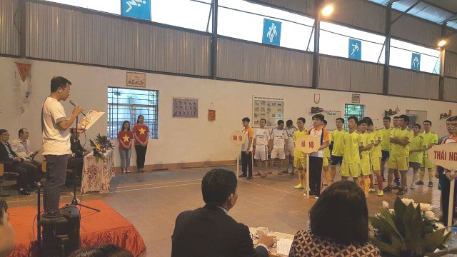 Đồng chí Nguyễn Mạnh Hùng – Chủ tịch Hội đông Trường phát biểu chúc mừng các vận động viên trước trận đấu