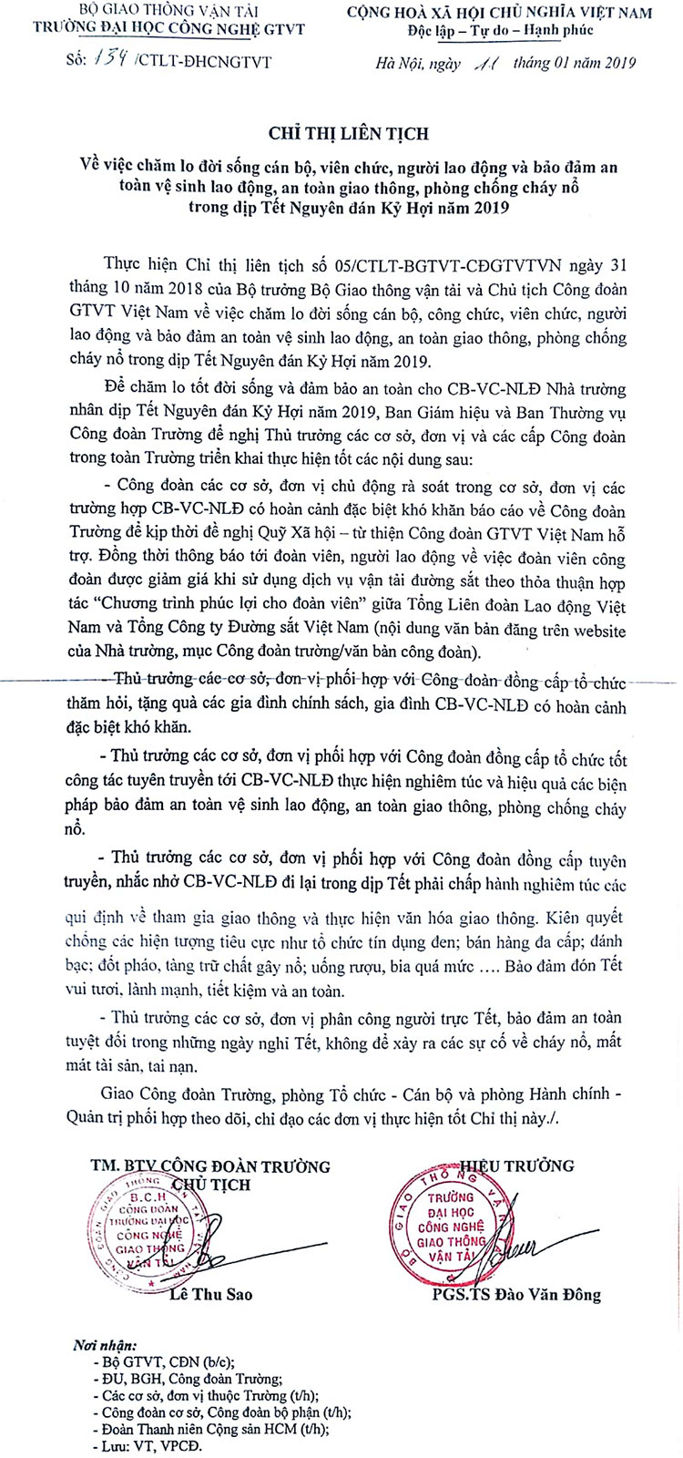 Chỉ thị liên tịch chăm lo đời sống cán bộ, viên chức, người lao động và bảo đảm an toàn vệ sinh lao động, an toàn giao thông, phòng chống cháy nổ trong dịp Tết Nguyên đán Kỷ Hội năm 2019 11/01/2019 16:01