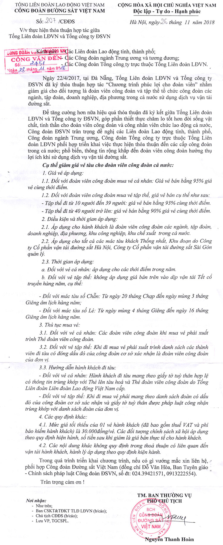 Thực hiện thỏa thuận hợp tác giữa Tổng Liên đoàn LĐVN và Tổng công ty ĐSVN