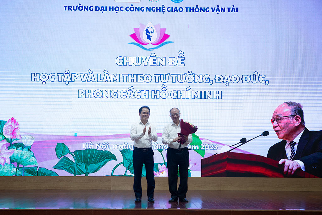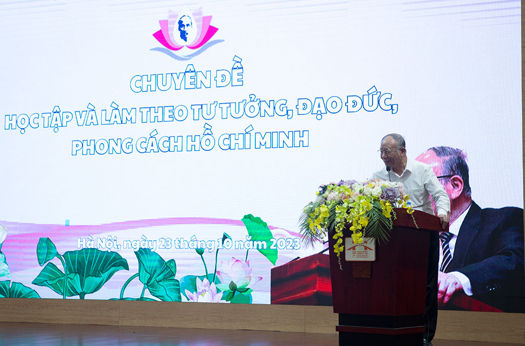GS.TS Hoàng Chí Bảo - Chuyên gia cao cấp, nguyên Ủy viên Hội đồng lý luận Trung ương của Đảng Cộng sản Việt Nam, Chủ tịch Hội đồng Khoa học Viện Khoa học nghiên cứu nhân tài - nhân lực chia sẻ với sinh viên về chuyên đề "học tập và làm theo tư tưởng, phong cách, đạo đức Hồ Chí Minh"