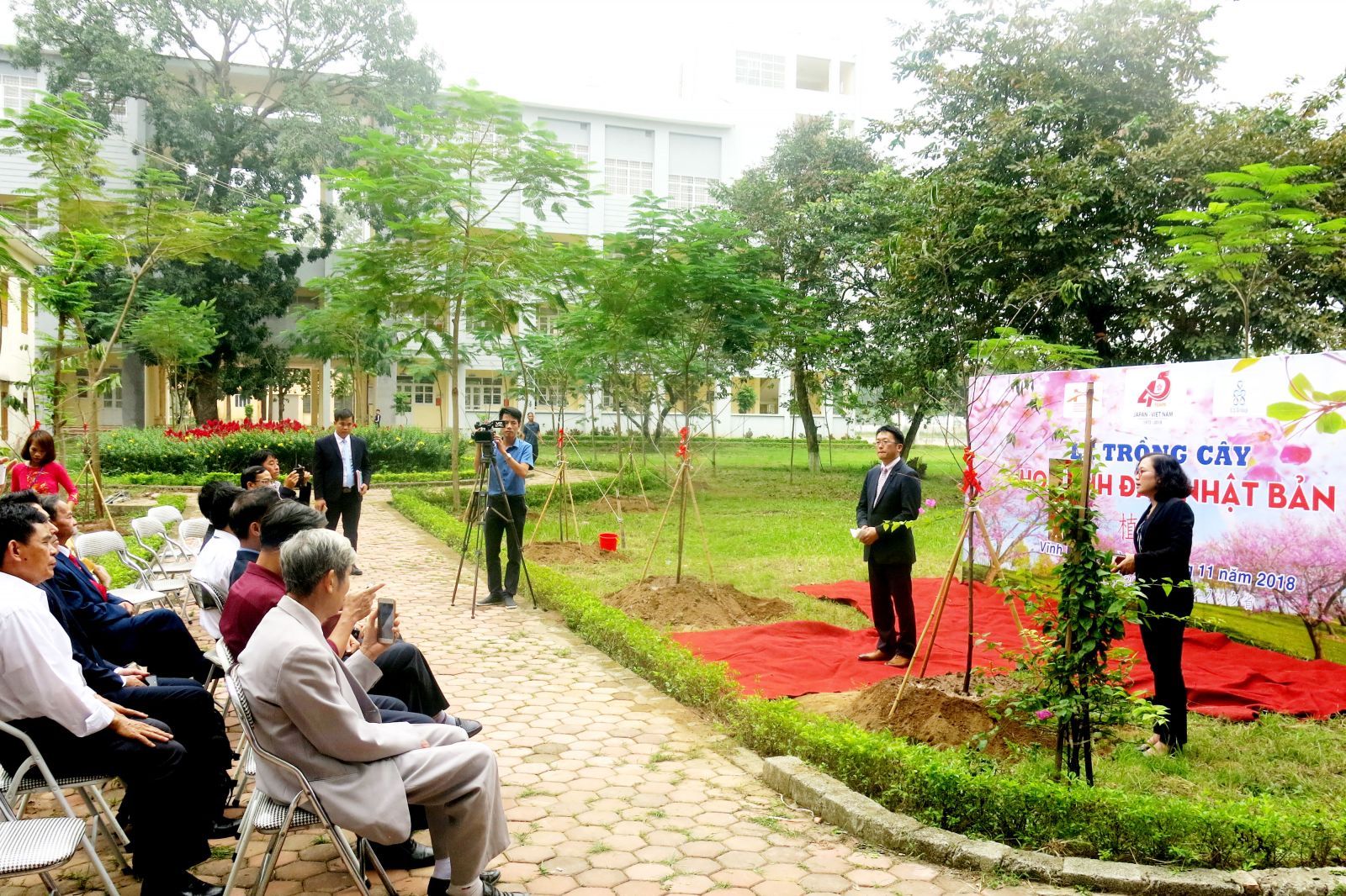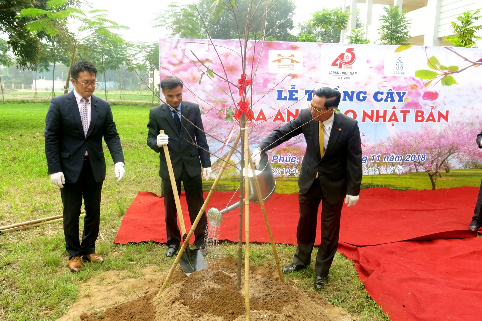 Lãnh đạo Nhà trường, lãnh đạo địa phương cùng doanh nghiệp Nhật Bản tham gia hoạt động trồng cây và cùng nhau ghi lại những khoảnh khắc Nhật Bản đầu tiên trong khuôn viên Nhà trường