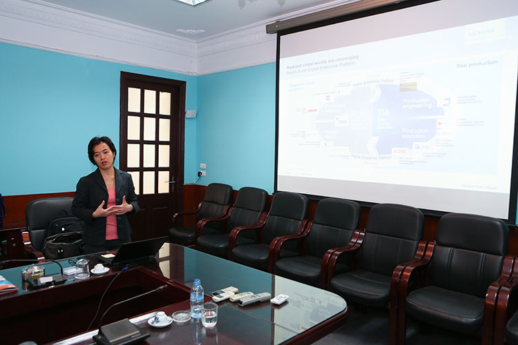 Tại buổi làm việc, bà Pallas Gao - Giám đốc Khu vực Asean, Australia, New Zealand đã giới thiệu về các lĩnh vực hoạt động của công ty, các ứng dụng công nghệ hiện tại được ứng dụng vào ngành cơ khí, công nghiệp chế tạo máy, ... của công ty Siemens với mong muốn chuyển giao công nghệ, các giải pháp công nghệ cho giảng viên, sinh viên Nhà trường, đặc biệt là sinh viên chuyên ngành cơ khí.