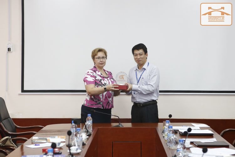 PGS.TS. Đào Văn Đông tặng quà lưu niệm cho bà Arbatskaya Evgeniia, Trưởng phòng hợp tác quốc tế - Trường Đại học nghiên cứu tổng hợp kỹ thuật quốc gia Irkutsk - Liên Bang Nga