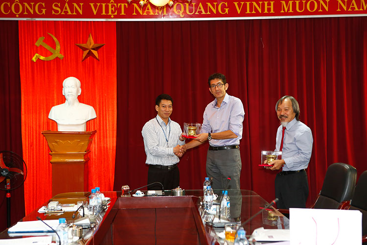 PGS.TS. Đào Văn Đông trao qua lưu niệm cho GS.TS. FIORIO Bruno - Trưởng khoa Công trình, Đại học Cergy Pontoise