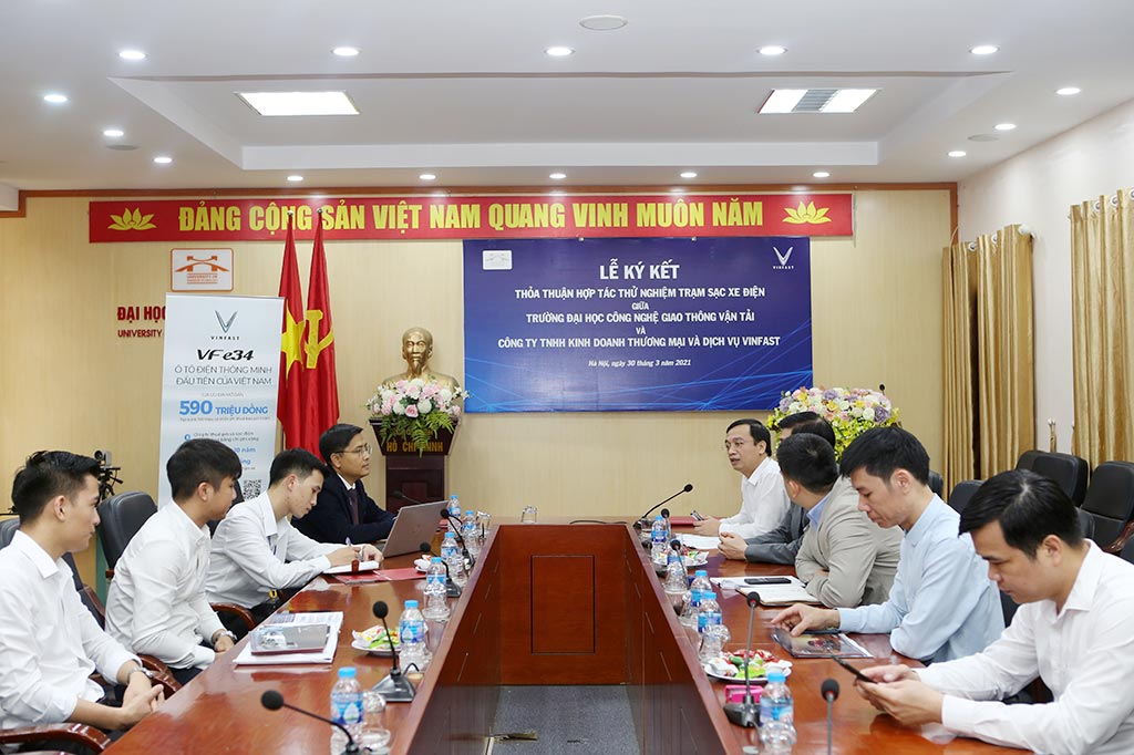 Ngày 30/03/2021, Trường Đại học Công nghệ Giao thông vận tải và Công ty TNHH Kinh doanh thương mại và dịch vụ VinFast đã ký kết thỏa thuận hợp tác lắp đặt thử nghiệm trạm sạc xe điện nhằm nâng cao khả năng nghiên cứu, ứng dụng công nghệ về trạm sạc, xe điện góp phần giảm thiểu khí thải, tiết kiệm năng lượng và bảo vệ môi trường. Tham dự lễ ký kết có TS Nguyễn Mạnh Hùng, Phó Hiệu trưởng Nhà trường, ông Lê Hoàng Hải- Giám đốc Trung tâm phát triển trạm pin, Công ty TNHH Kinh doanh thương mại và dịch vụ VinFast.