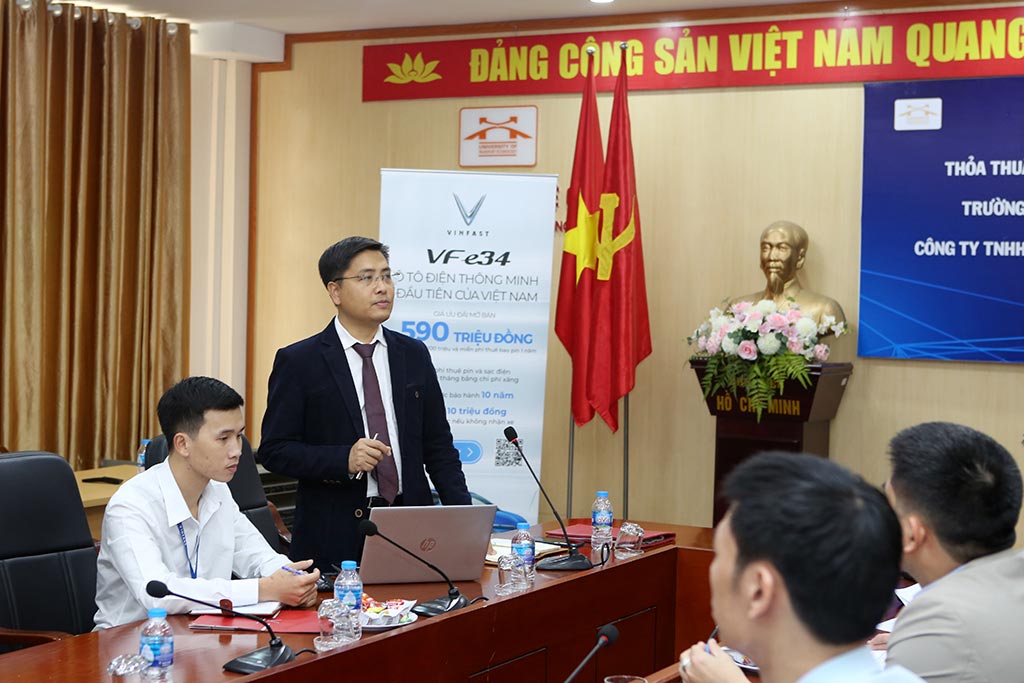 Phát biểu tại buổi lễ, TS. Nguyễn Mạnh Hùng – Phó Hiệu trưởng Nhà trường đánh giá rất cao những nội dung mà hai bên đã thảo luận hợp tác, nhất là việc lắp đặt thử nghiệm trạm sạc xe điện tại Nhà trường. Với xu hướng phát triển của xe điện, những kết quả từ quá trình thử nghiệm hứa hẹn sẽ đem lại hiệu quả cho sự phát triển của công nghệ trạm sạc, xe điện không chỉ cho đối tác VinFast mà còn cho cả thị trường xe điện ở Việt Nam. Song song với việc lắp đặt thử nghiệm trạm sạc, TS Nguyễn Mạnh Hùng cũng đề nghị hai bên tiếp tục nghiên cứu mở rộng hợp tác về trao đổi thông tin, công nghệ, cùng tham gia những dự án chung trong lĩnh vực xe điện, quy hoạch trạm sạc xe điện và lĩnh vực đào tạo.