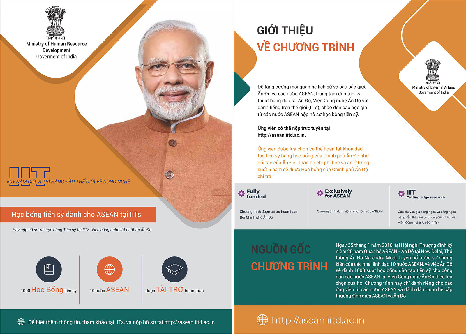 1. Tháng 1 năm 2018, Thủ tướng Narendra Modi đã công bố tại Hội nghị Thượng đỉnh kỷ niệm 25 năm quan hệ ASEAN - Ấn Độ tại New Delhi, đề nghị cấp 1000 học bổng tiến sĩ cho sinh viên các nước ASEAN tại các Học viện công nghệ Ấn Độ (IITs). Để thực hiện cam kết này, Bộ trưởng Bộ ngoại giao Ấn Độ tiến sĩ S. Jaishankar và Bộ trưởng Bộ Phát triển Nguồn nhân lực Ấn Độ, tiến sĩ Ramesh Pokhriyal 'Nishank' đã chính thức ra mắt Chương trình học bổng tại trụ sở Bộ Ngoại giao Ấn Độ vào thứ hai, ngày 16 tháng 9 năm 2019.