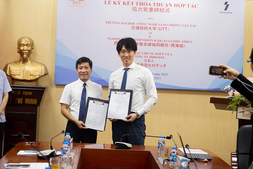 Ngày 28/6/2023, tại cơ sở đào tạo Hà Nội đã diễn ra Lễ ký kết thỏa thuận hợp tác giữa Trường ĐH Công nghệ GTVT với Nghiệp đoàn Nishinihon Kaigai Gyomu Shien nhằm sớm triển khai các chương trình hợp tác đào tạo, liên kết cử sinh viên các chuyên ngành đi thực tập tại Nhật Bản.