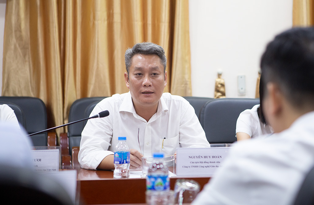 Ông Nguyễn Huy Hoàn - Chủ tịch Hội đồng thành viên Công ty TNHH Công nghệ Giáo dục Đông A giới thiệu về đơn vị mình trong buổi Lễ ký kết