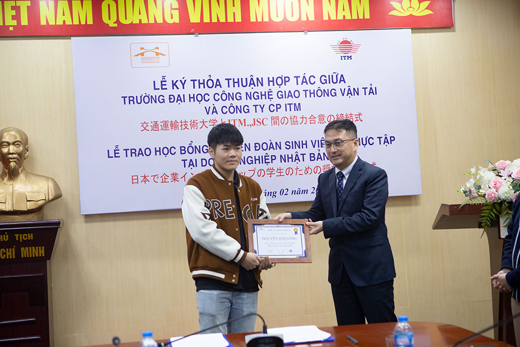 Ngay sau lễ ký kết hợp tác, đại diện phía công ty đã trao tặng học bổng cho sinh viên Nguyễn Hải Long lớp 69DCOJ11, chuyên ngành Kỹ thuật ô tô đã có thành tích xuất sắc trong quá trình học tập và tiễn đoàn sinh viên của Trường đi thực tập tại doanh nghiệp Nhật Bản trong tháng 2 này.
