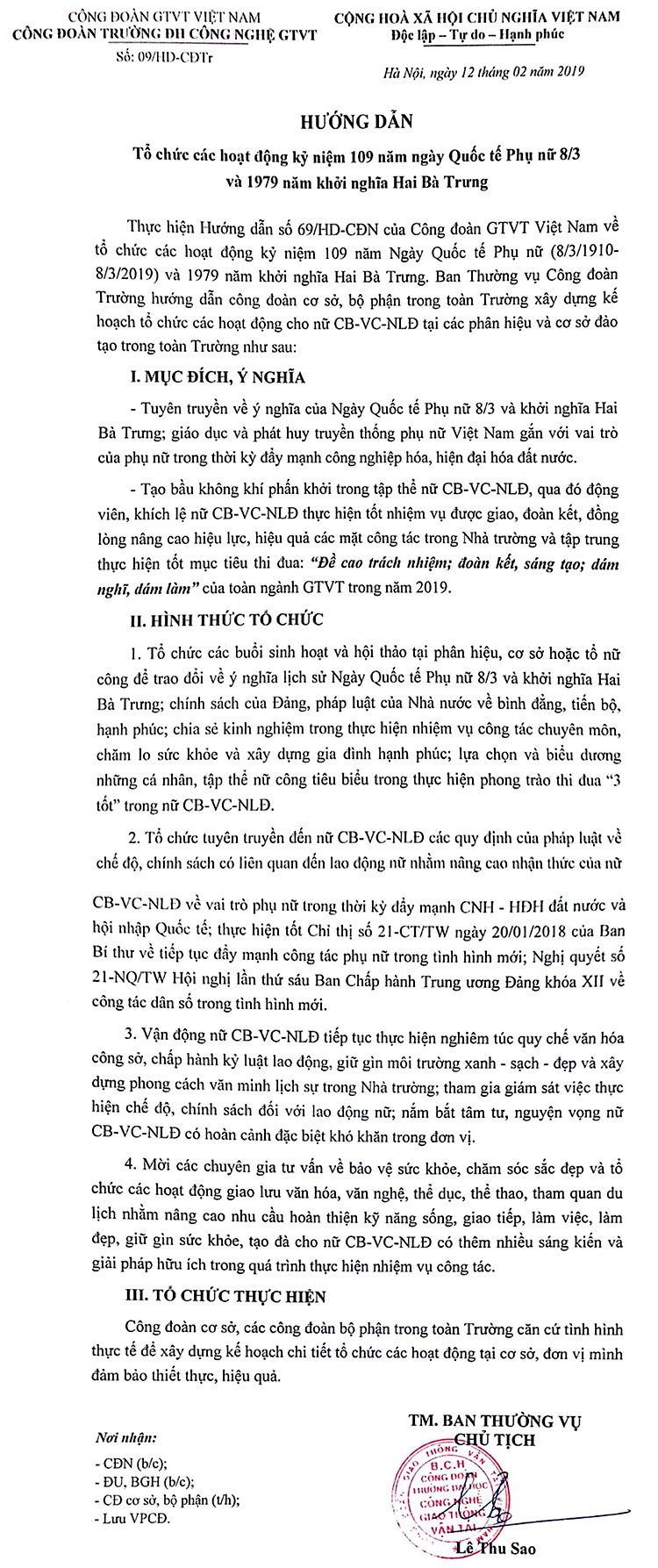 Hướng dẫn Tổ chức các hoạt động kỷ niệm 109 năm ngày Quốc tế Phụ nữ 8/3 và 1979 năm khởi nghĩa Hai Bà Trưng 22/02/2019 15:02