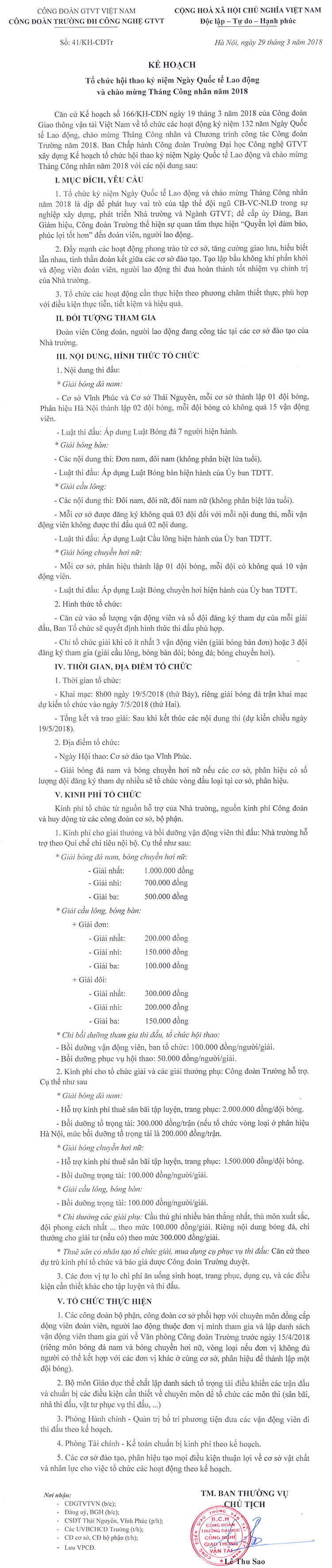 Kế hoạch Tổ chức hội thao kỷ niệm Ngày Quốc tế Lao động và chào mừng Tháng Công nhân năm 2018 30/03/2018 16:03
