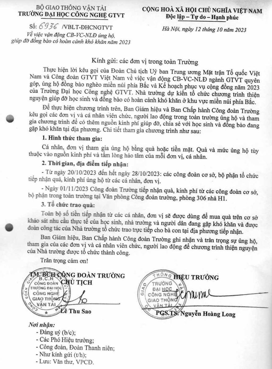 Thông báo về việc vận động CB-VC-NLĐ ủng hộ, giúp đỡ đồng bào có hoàn cảnh khó khăn năm 2023 27/10/2023 17:10 File đính kèm VBLT---HCNGTVT-van-dong-thien-nguyen-2023.pdf
