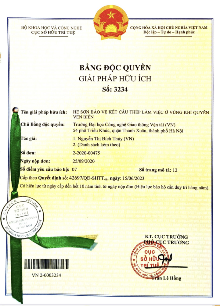 Bằng độc quyền giải pháp hữu ích: Hệ sơn bảo vệ kết cấu thép làm việc ở vùng khí quyển ven biển