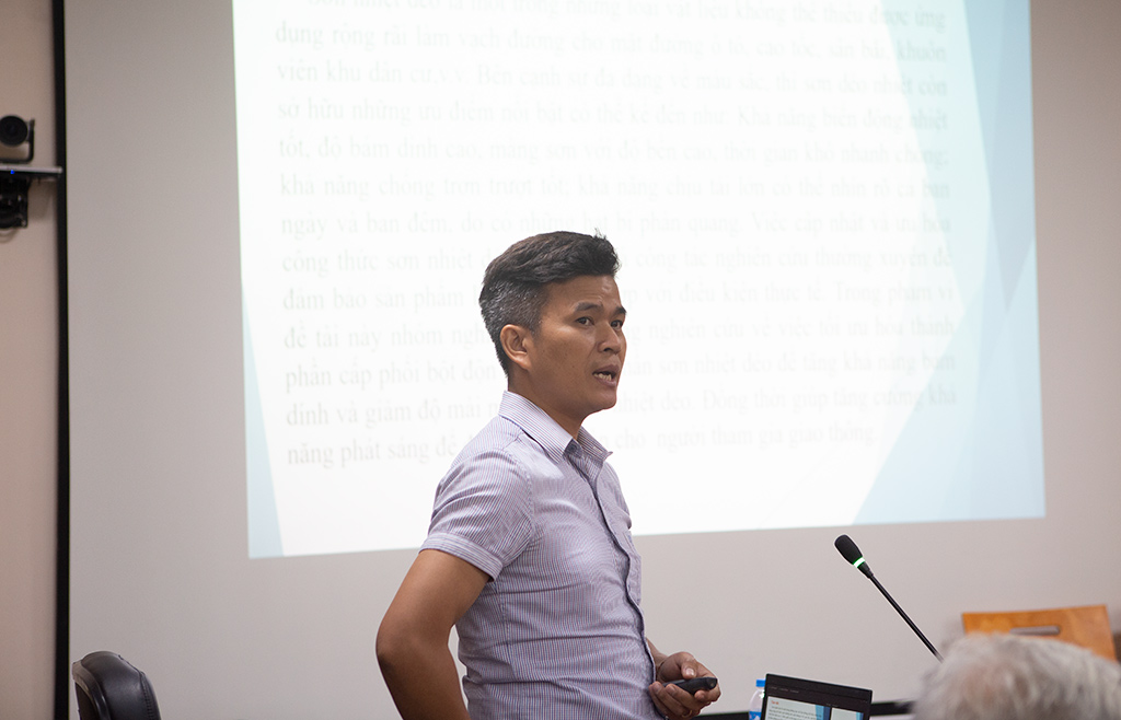 Báo cáo viên Lê Văn Kiên trình bày báo cáo chủ đề "Nghiên cứu thành phần cấp phối cỡ hạt chất độn để làm tăng khả năng bám dính và chống mài mòn cho sơn kẻ đường hệ nhiệt dẻo”