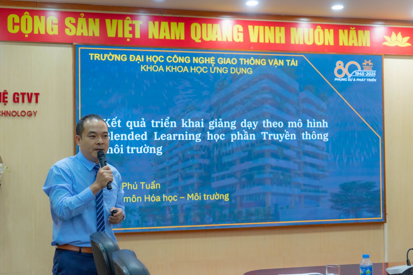 Trong khuôn khổ hội thảo, các đại biểu đã trình bày nhiều tham luận chuyên sâu, vừa mang tính học thuật vừa thực tiễn. TS. Nguyễn Xuân Quang (BM Vật lý Công nghệ) chia sẻ kinh nghiệm giảng dạy học phần Vật lý đại cương, phân tích thuận lợi, khó khăn khi kết hợp lớp học trực tuyến và trực tiếp, đồng thời đề xuất các giải pháp nâng cao hiệu quả học tập. TS. Lê Phú Tuấn (Bộ môn Hóa học - Môi trường) giới thiệu kinh nghiệm triển khai học phần Truyền thông môi trường, nhấn mạnh cách thiết kế bài giảng phù hợp đặc thù môn học và đề xuất các giải pháp thực tiễn nâng cao hiệu quả Blended Learning.