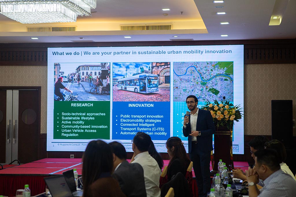 Hội thảo diễn ra hai phiên, phiên 1 là Hệ thống xe điện chia sẻ tại thành phố Hà Nội; phiên 2 là MRV và lồng ghép giới trong giao thông điện.
