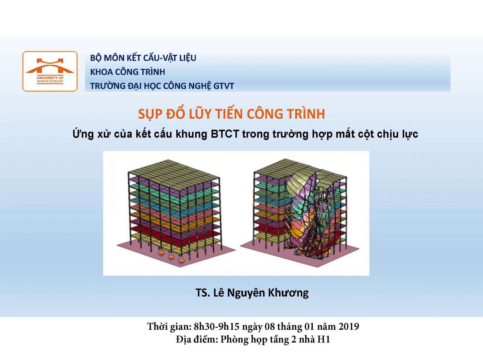 Nội dung 1: Báo cáo về “Sụp đổ lũy tiến công trình - Ứng xử của kết cấu khung BTCT trong trường hợp mất cột chịu lực” do TS Lê Nguyên Khương – Trưởng Bộ môn Kết cấu – Vật liệu trình bày. Trong đó, tập trung nghiên cứu sụp đổ lũy tiến công trình; các phương pháp tính toán thiết kế theo tiêu chuẩn Mỹ và kết quả mà nhóm nghiên cứu đạt được trong việc thí nghiệm và mô hình hóa nút khung BTCT có xét tới hiệu ứng động của tải trọng và ứng xử phi tuyến của kết cấu trong trường hợp cột chịu lực bị phá hủy đột ngột