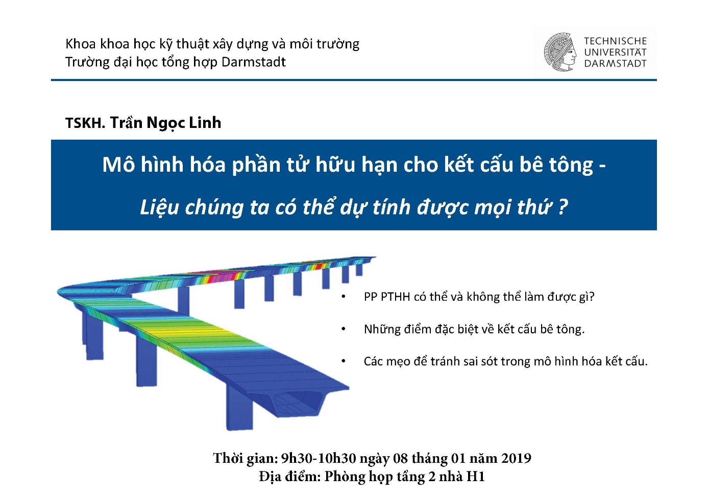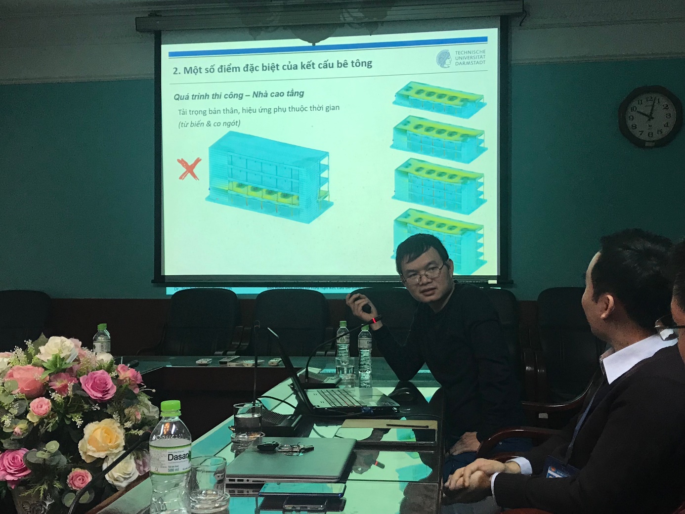 Ngày 08/01/2019, Bộ môn Kết cấu - Vật liệu, Khoa Công trình phối hợp Nhóm nghiên cứu mạnh về Tính toán kết cấu hiệu năng cao tổ chức Semina “Công nghệ mô phỏng số trong tính toán và phân tích kết cấu Bê tông cốt thép”. Tham dự chương trình có TS Ngô Thị Thanh Hương, Phó Trưởng khoa -Phụ trách Khoa công trình – Trường Đại học Công nghệ GTVT, TSKH Trần Ngọc Linh - Khoa khoa học kỹ thuật xây dựng và môi trường, Trường Đại học tổng hợp Darmstadt – CH Đức, và hơn 30 nhà khoa học, cán bộ, giảng viên, học viên ngành công trình.