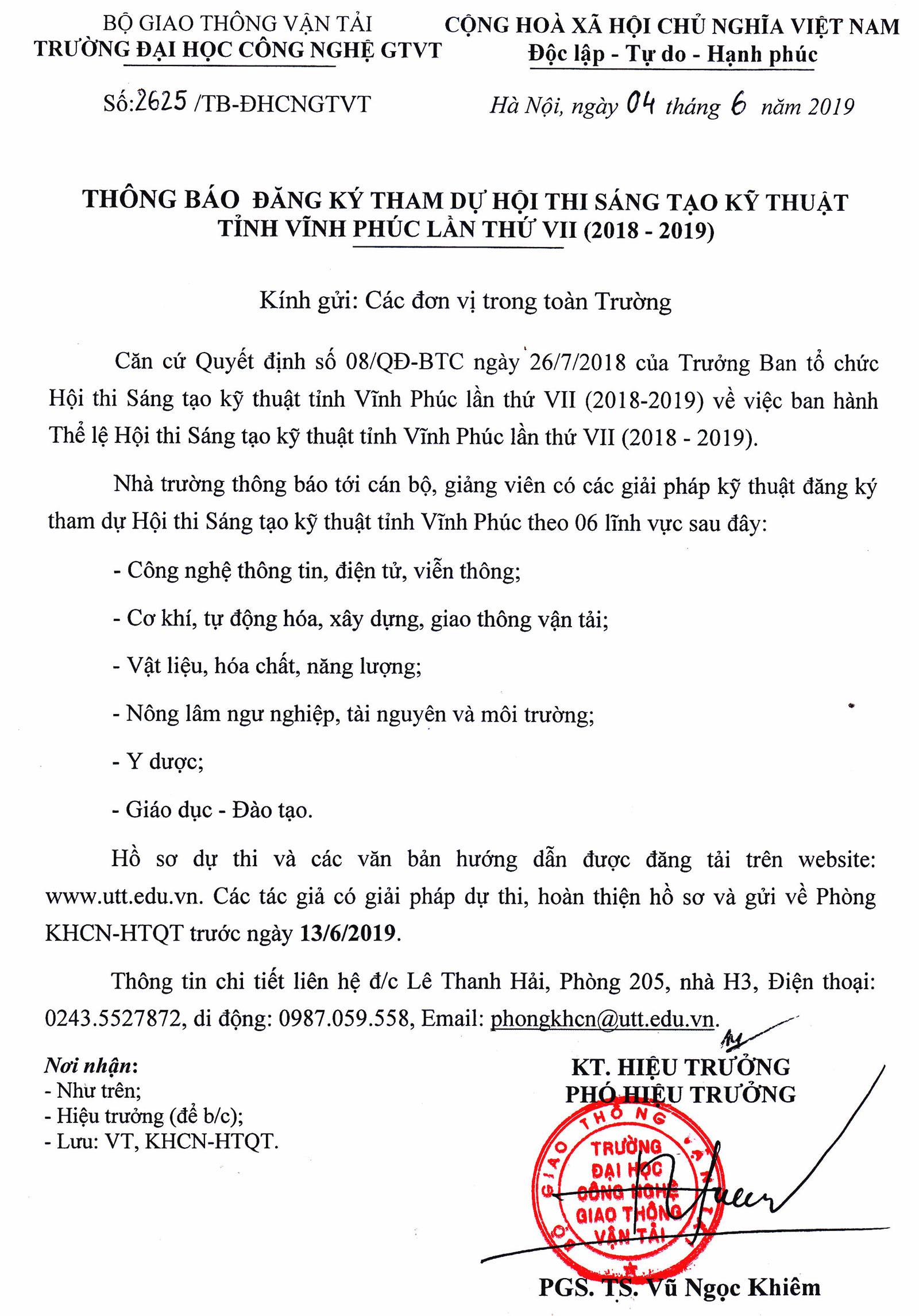 Thông báo Đăng ký tham dự Hội thi sáng tạo kỹ thuật Tỉnh Vĩnh Phúc lần thứ VII (2018-2019) 04/06/2019 16:06 File đính kèm Ke-hoach-HT-lan-VII---lan7_2018---2019-.doc Q---ban-hanh-kem-The-le-Hoi-thi-lan-VII--2018-2019-.doc Tin liên quan UTT thúc đẩy hợp tác với các đối tác Úc trong đào tạo, nghiên cứu và hỗ trợ sinh viên 30/10/2025 Lễ ký kết hợp tác đào tạo Chương trình liên kết 2 + 2 giữa UTT và Trường Đại học Giao thông Quốc gia Hàn Quốc (KNUT) 20/10/2025 Hội thảo Quốc tế về Đường sắt tốc độ cao ICHSR năm 2025 17/10/2025 Đổi mới và nâng cao hiệu quả đào tạo từ xa trong bối cảnh chuyển đổi số tại UTT 02/10/2025 Hội thảo quốc tế về giao thông điện: Hướng tới chuyển đổi công bằng và bình đẳng giới tại Việt Nam 27/09/2025 UTT tăng cường hợp tác quốc tế với Trường Đại học Quốc gia Pukyong (Hàn Quốc) trong lĩnh vực Logistics và Giao thông thông minh 25/09/2025