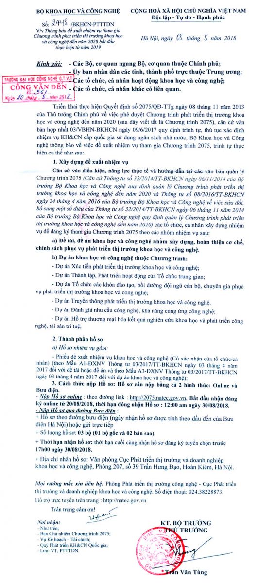 Thông báo đề xuất nhiệm vụ tham gia chương trình phát triển thị trường khoa học và công nghệ đến năm 2020 16/08/2018 12:08 File đính kèm BKHCN-PTTTDN-2448-561.PDF